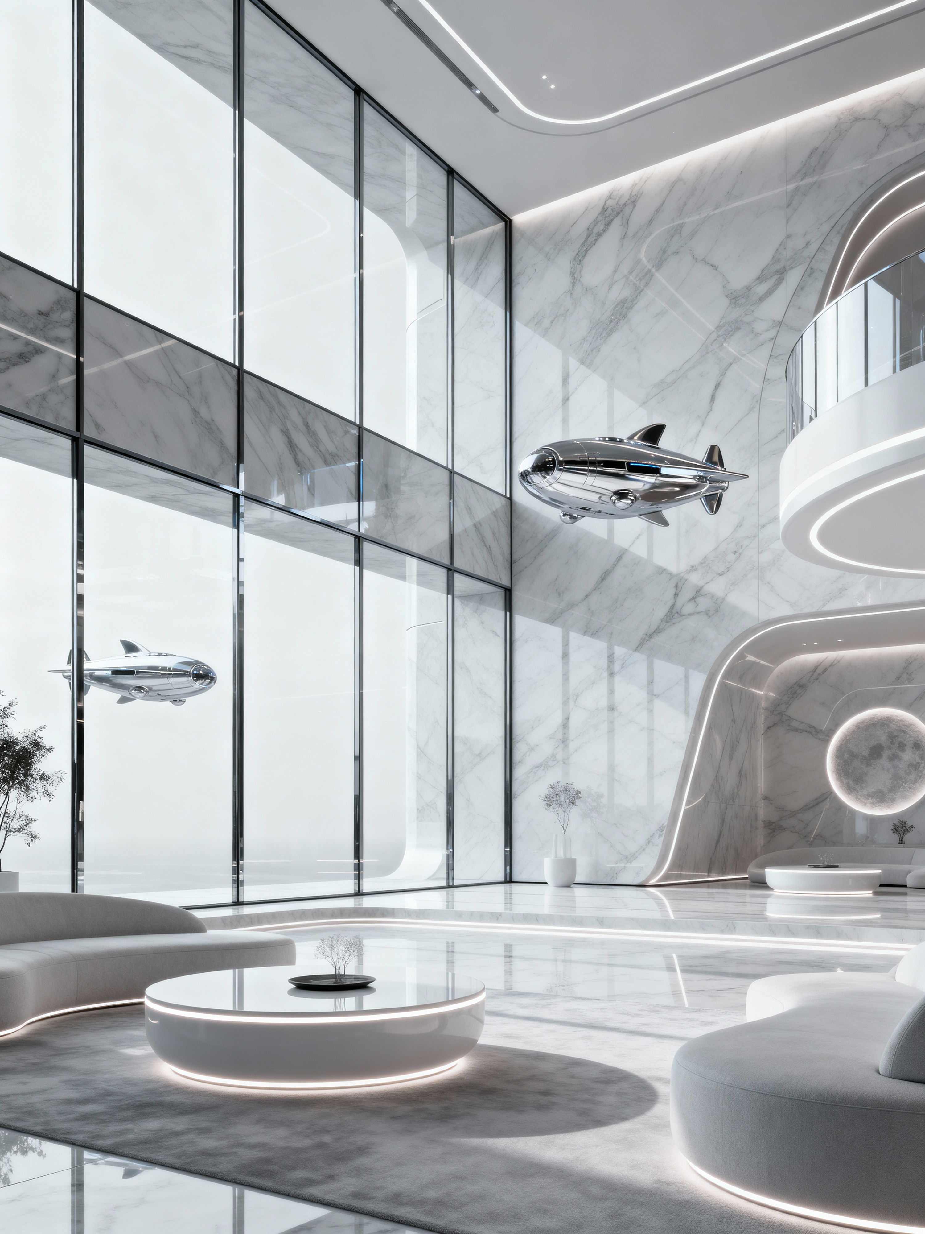 onsen with futuristic style . with smooth polished marble and smooth marble and glass panes and spaceship interior and monochromatic palette and light colors and floating surfaces and circular shapes