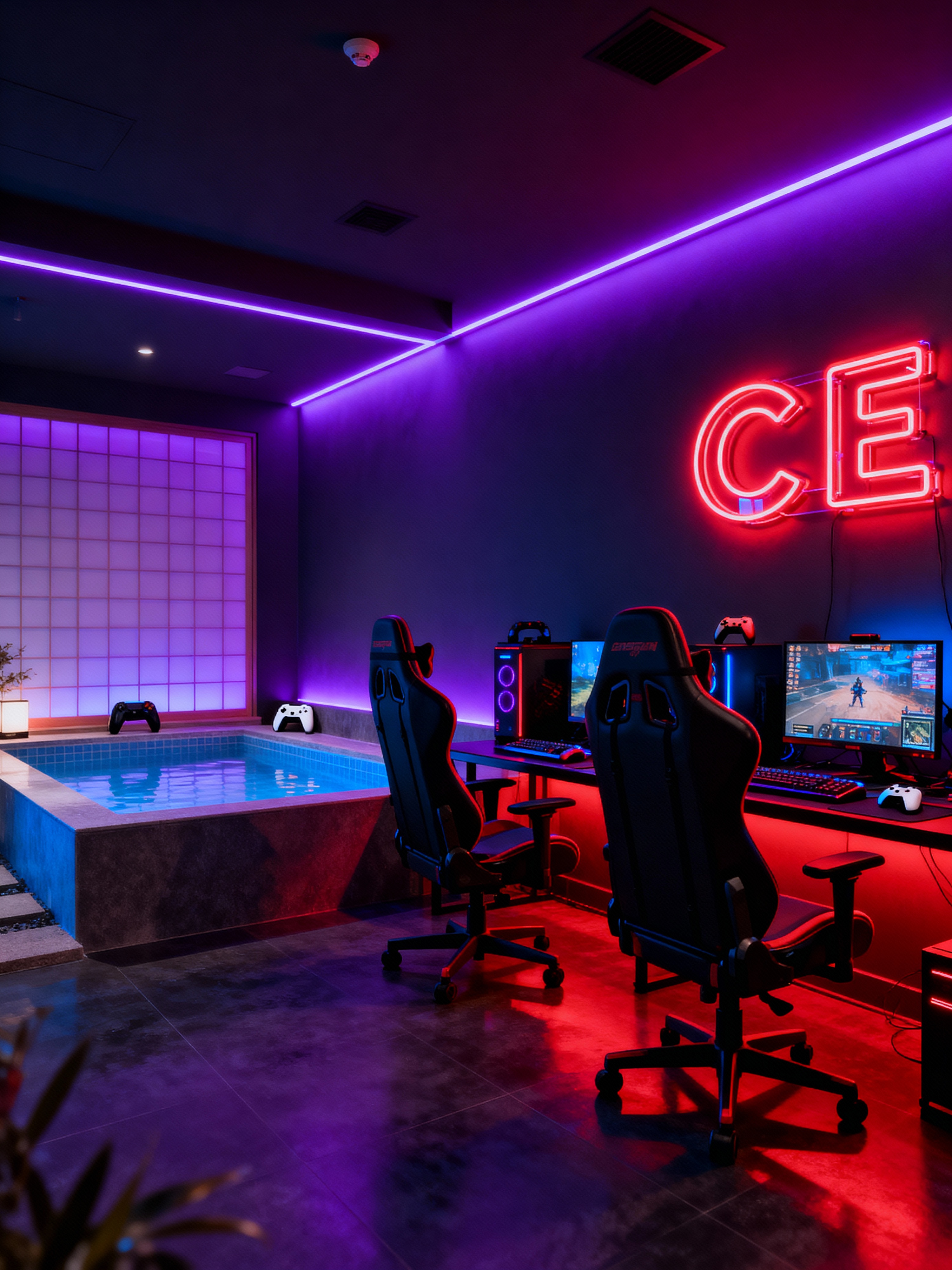 onsen with gaming room style . with gaming chair and neon lights and purple, red and blue fade light and video game consoles and purple and red lights and dark room and neon letters on wall and dark lit room
