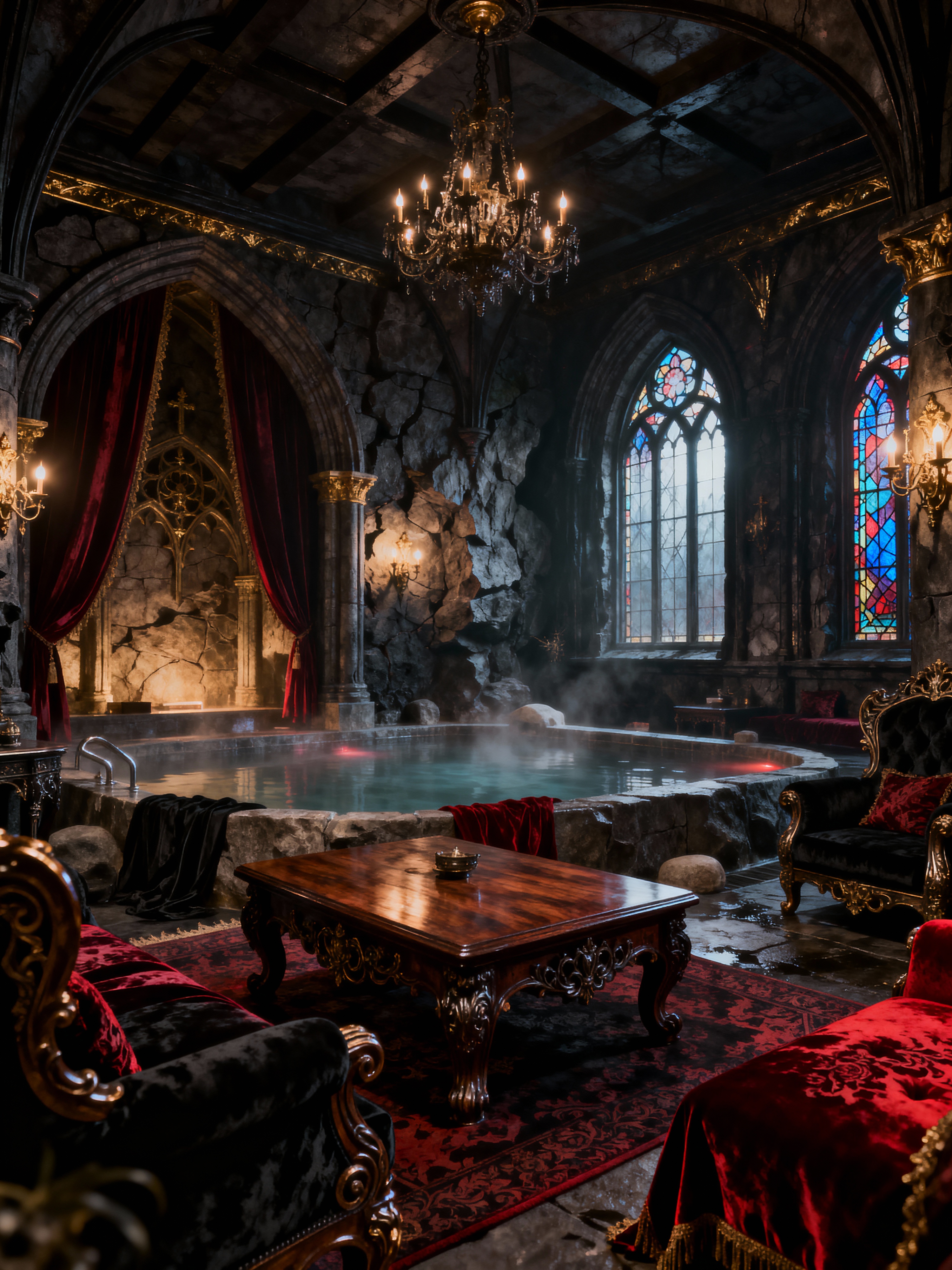 onsen with gothic style . with heavy furniture and ornate details and cathedral style and stone textures and rich fabrics and dramatic atmosphere and dark colors and arched windows
