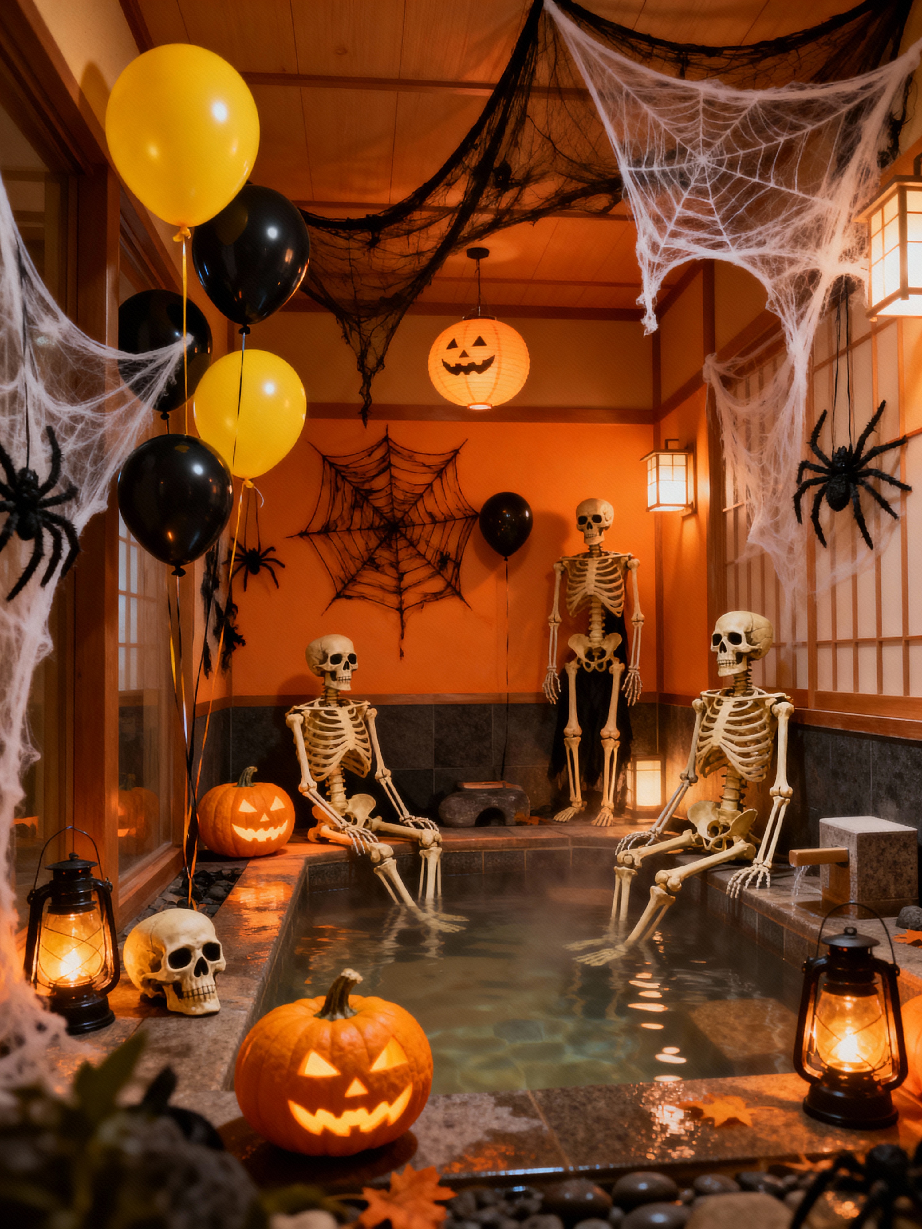 onsen with halloween style . with human skulls and lanterns and yellow black balloons and cobwebs and skeletons sitting and standing and lanterns and spiderwebs and glowing pumpkins