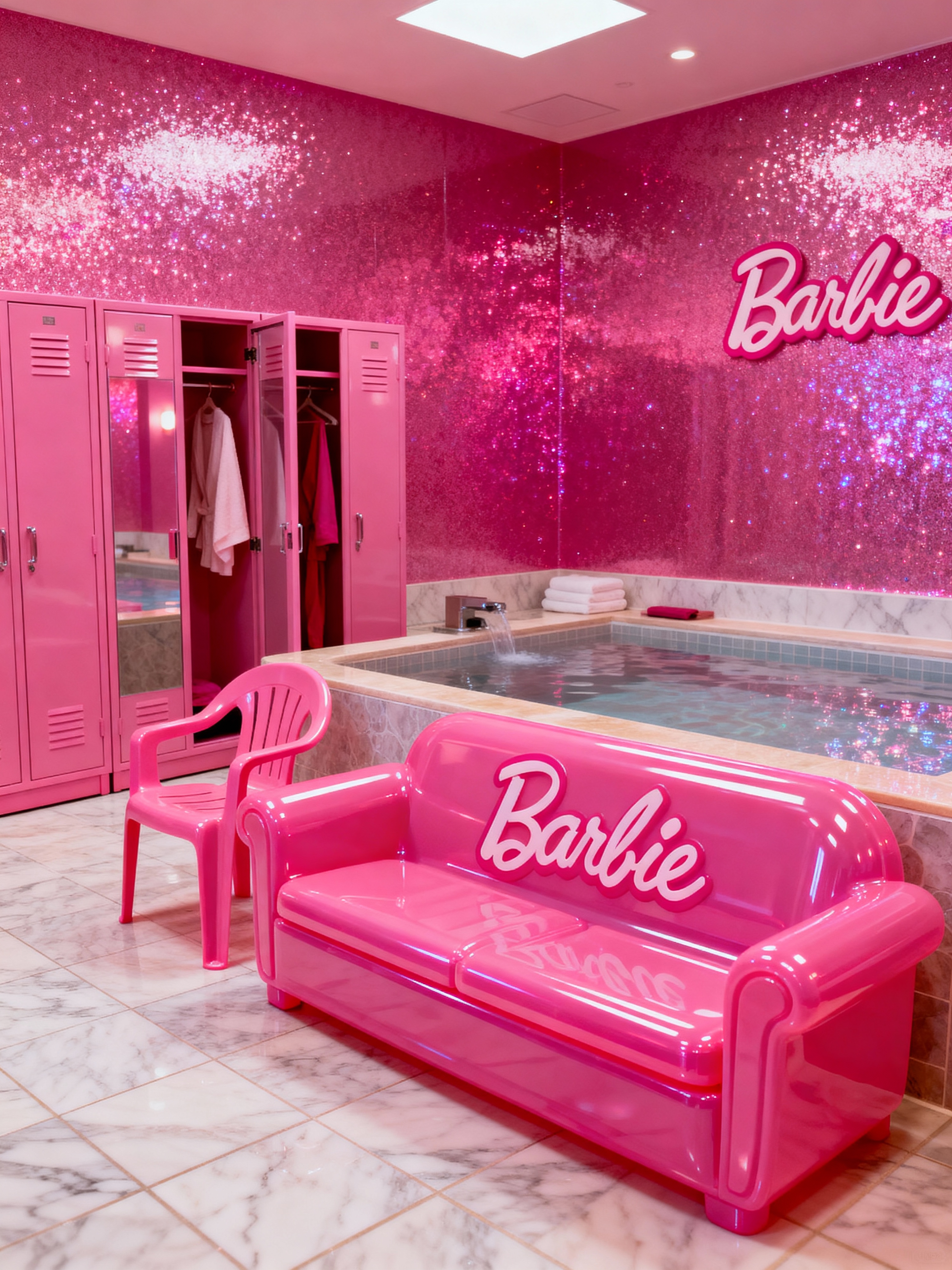 onsen with hot pink style . with barbie plastic interior and barbie closet and hot pink barbie walls and barbie sofa and hot pink barbie colors and barbie glitter and sparkle and barbie chairs and barbie bold rosy hues like fuchsia and magenta