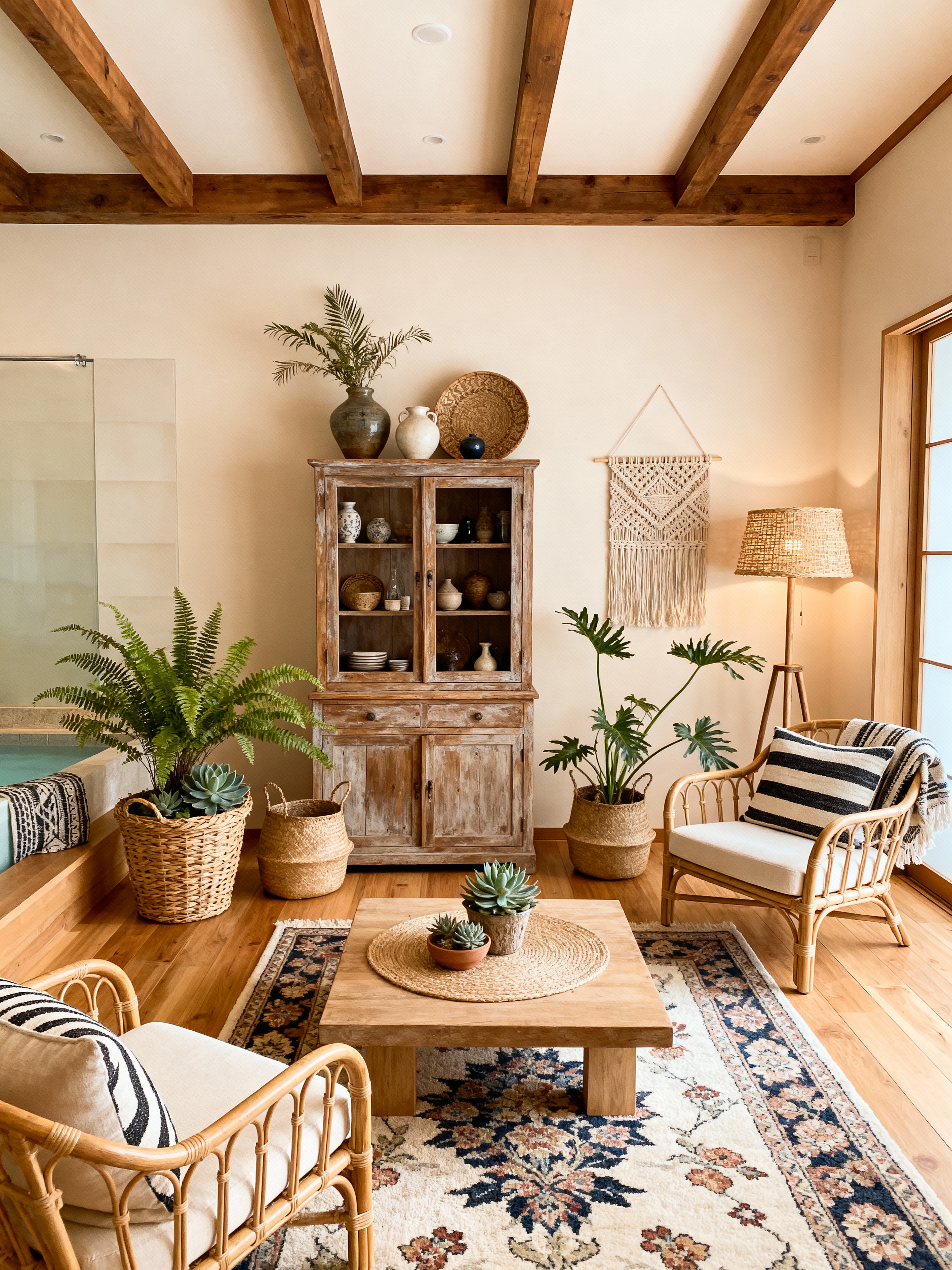 onsen with modern boho style . with plants and rattan furniture and collected look and neutral palette and vintage furniture and patterns and potted plants and wood decor