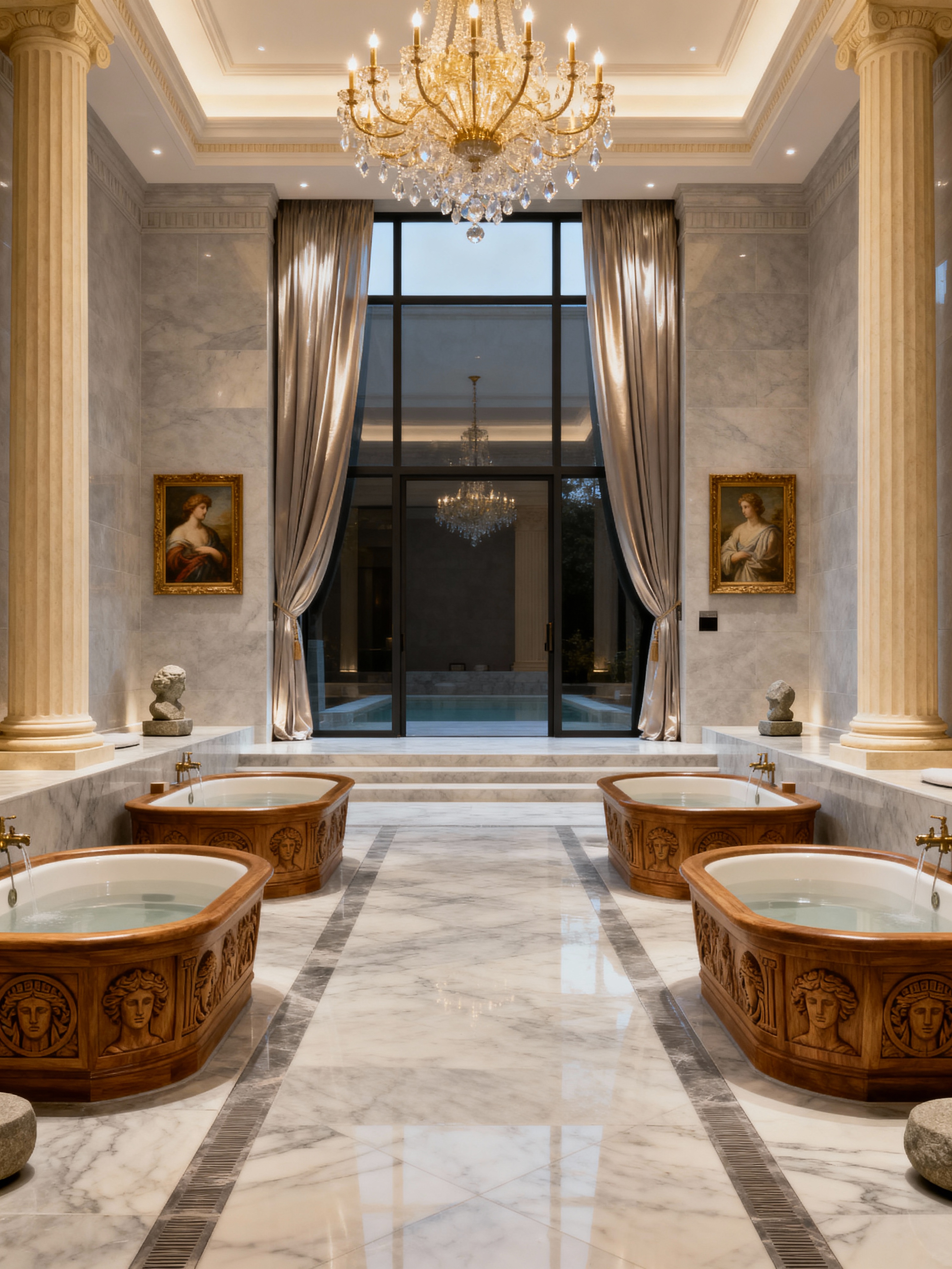 onsen with neoclassic style . with classical architectural details and emphasized horizontal and vertical lines and symmetric layouts and elegant and sophisticated and timeless artwork and thoughtful minimalism and high ceilings and timeless furniture