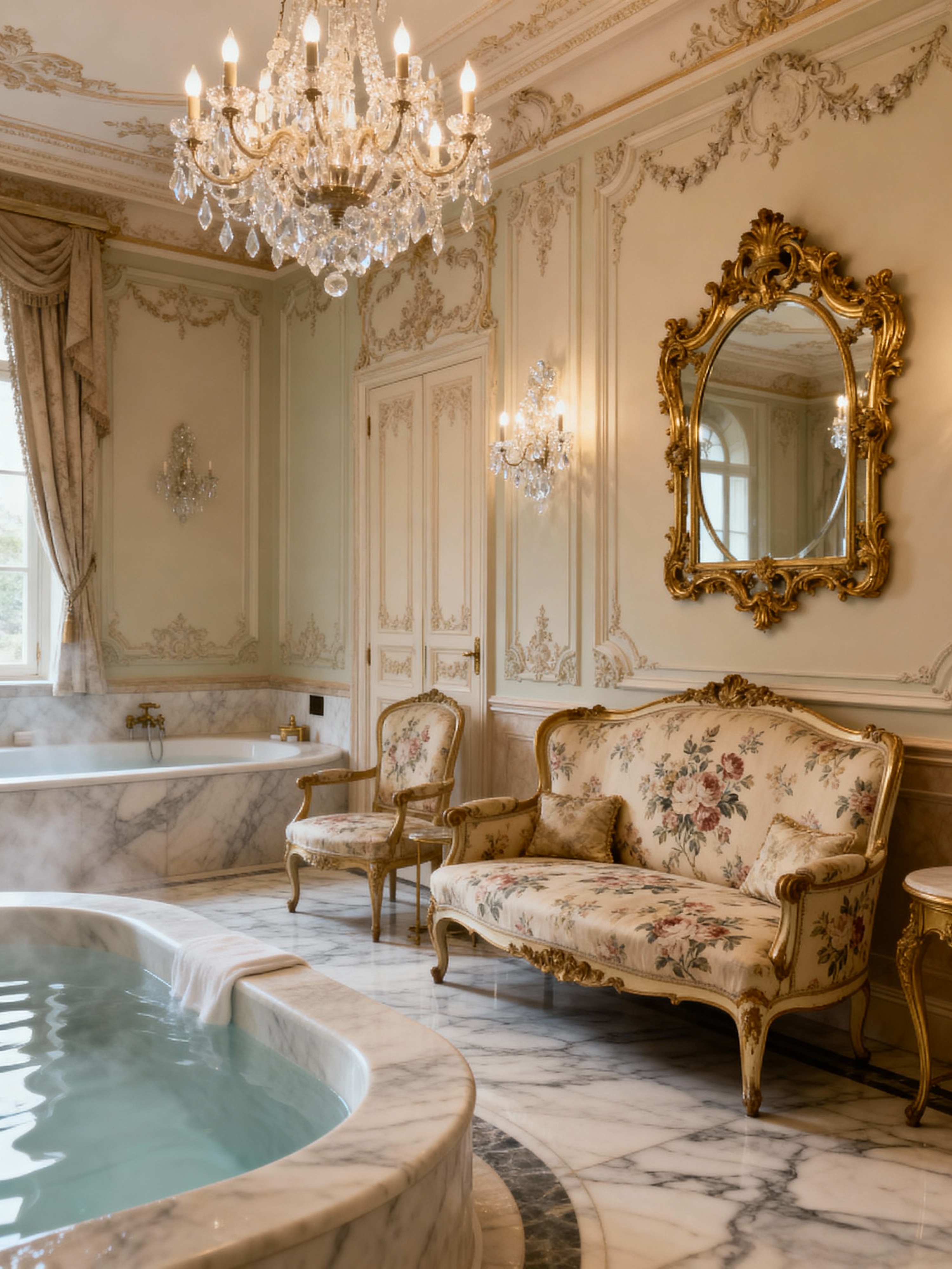onsen with parisian style . with vintage pieces and refined style and antique furniture and french elegance and european flair and sophisticated charm and classic details and ornate moldings