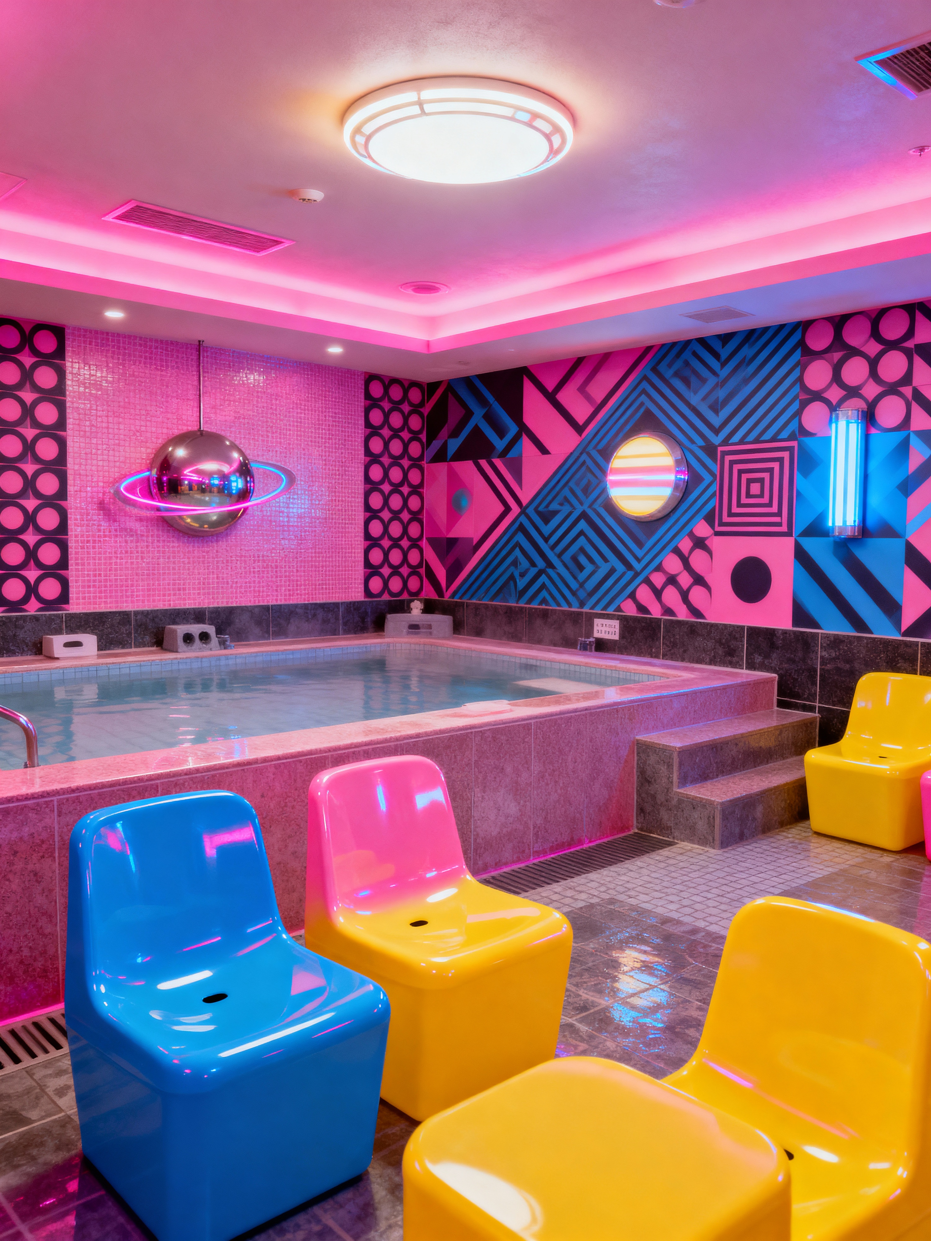 onsen with retro style . with vintage revival and bold patterns and funky decor and geometric shapes and mod style and space age and plastic furniture and bright colors