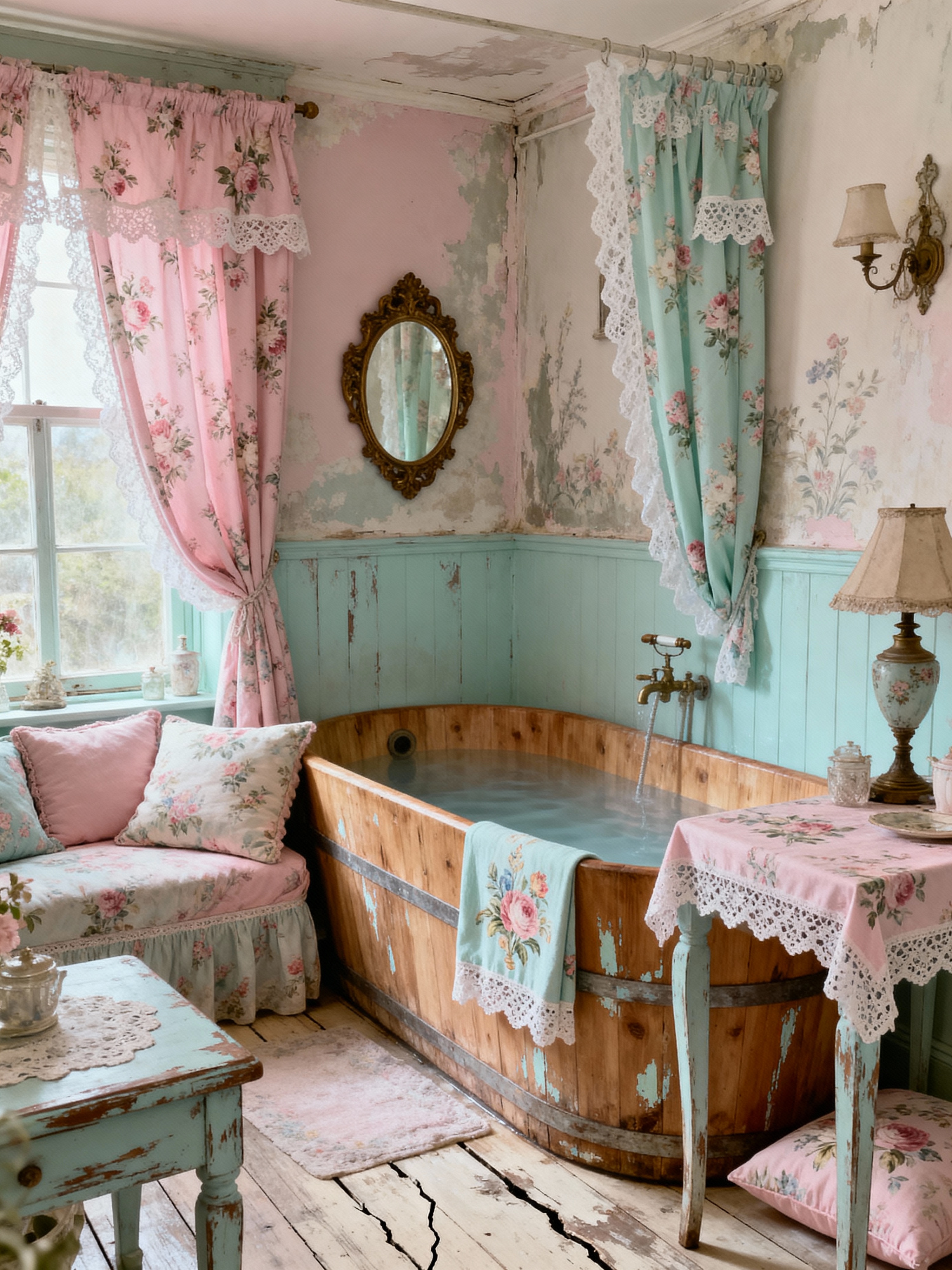 onsen with shabby chic style . with delicate details and cottage feel and floral patterns and distressed furniture and pastel colors and vintage charm and weathered finishes and romantic style