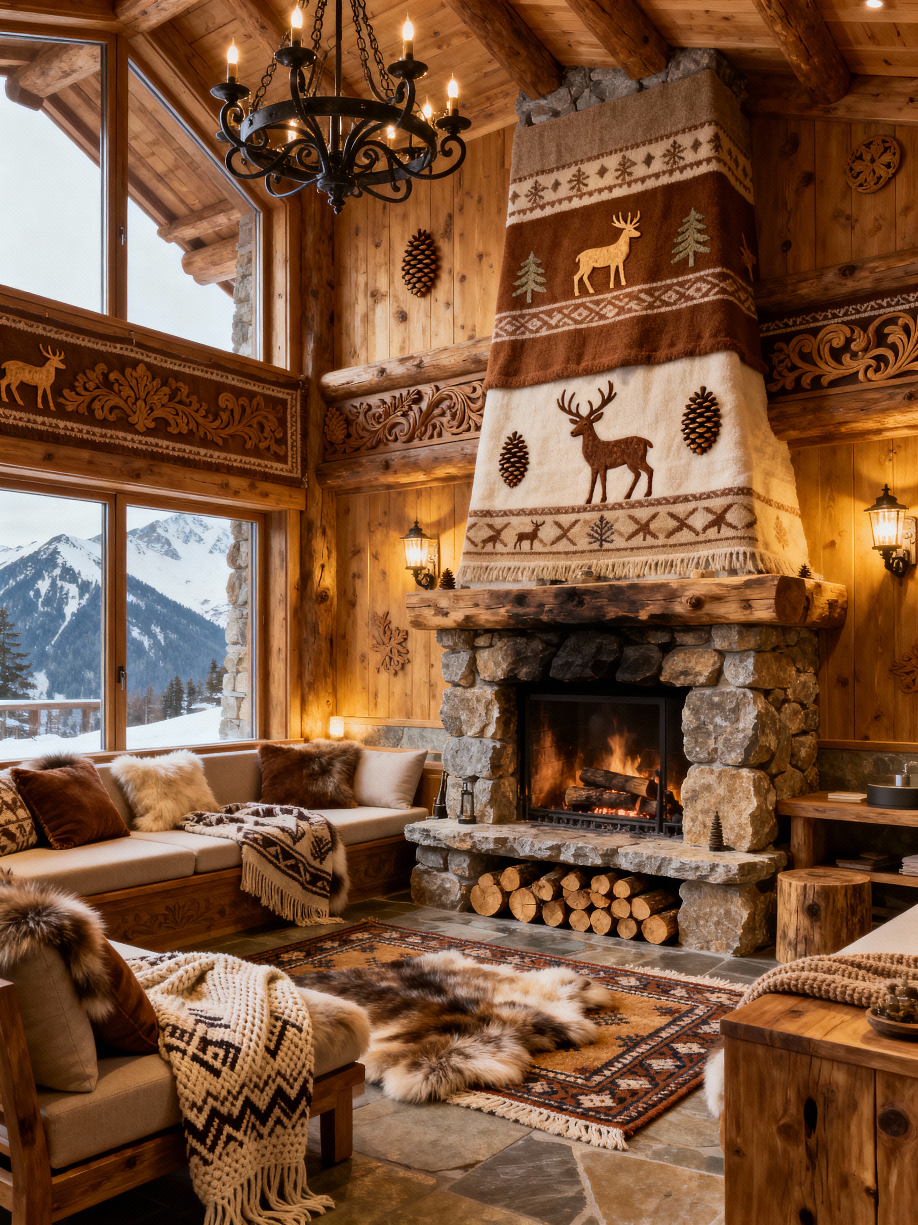onsen with ski chalet style . with exposed construction beams and nature-inspired and wooden walls and decorative carving and mouldings and exposed wood and layered textiles and animal motifs and stone fireplace