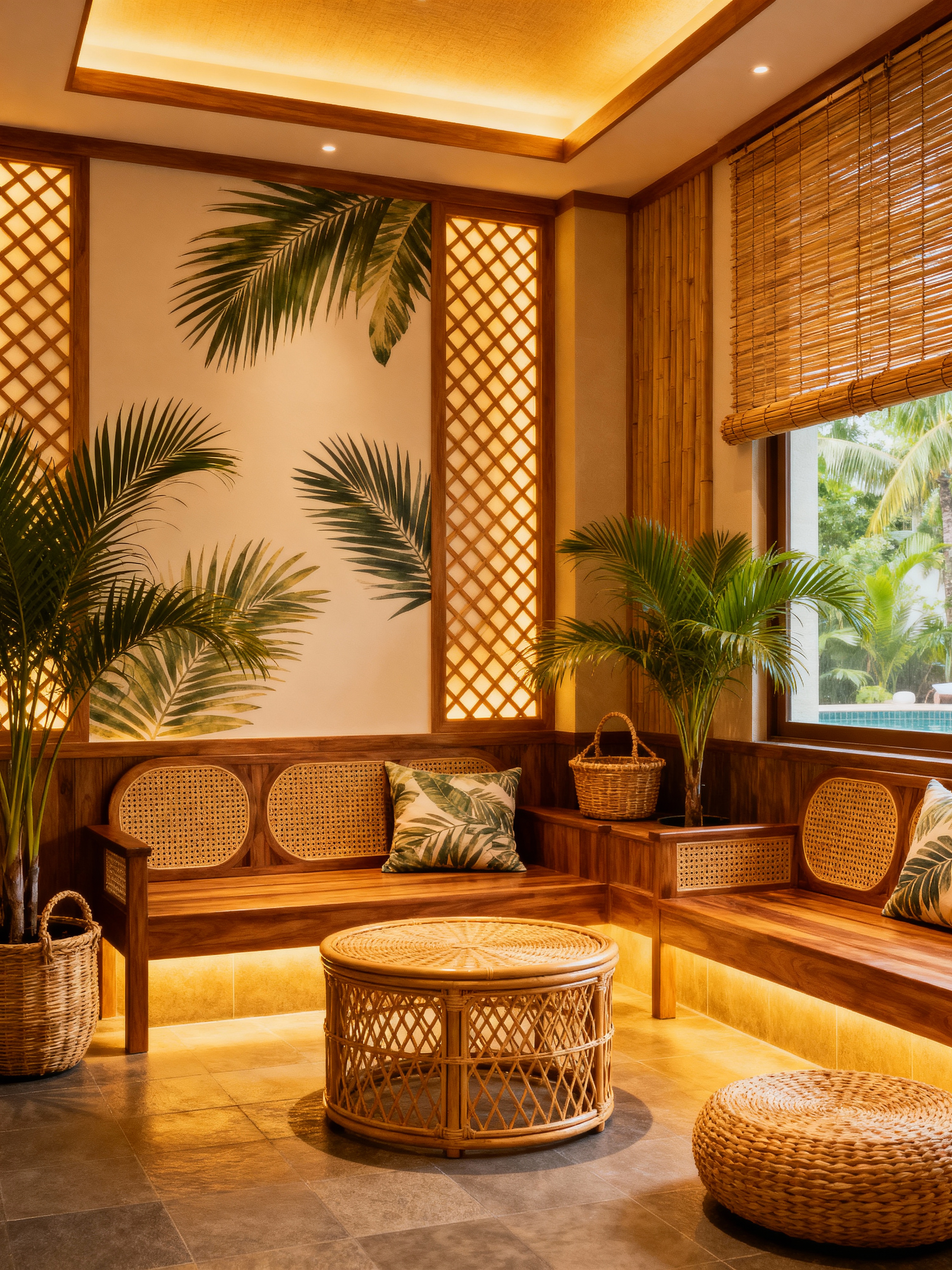 onsen with tropical style . with teak and cane motifs and palm leaves and lattice prints and palm trees and rattan and bamboo and wicker
