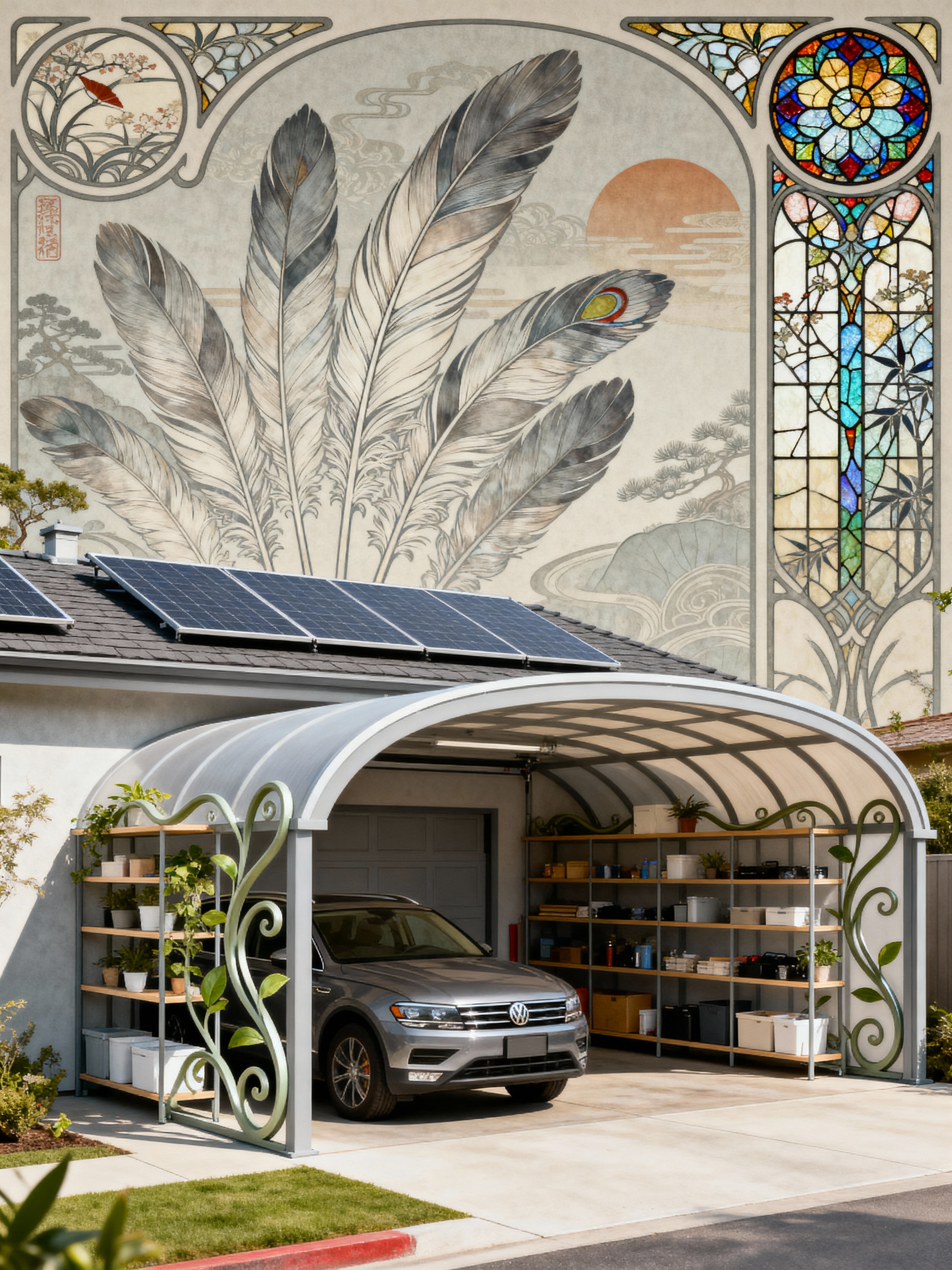 outdoor garage with art nouveau style with storage racks and canopy and cars and roof solar panels and carport and carport roof and storage racks. . with wallpaper patterns of feathers and soft, rounded lines and ashy colors and arches and curved forms and asymmetrical shapes and curving, plant-like embellishments and japanese motifs and stained glass