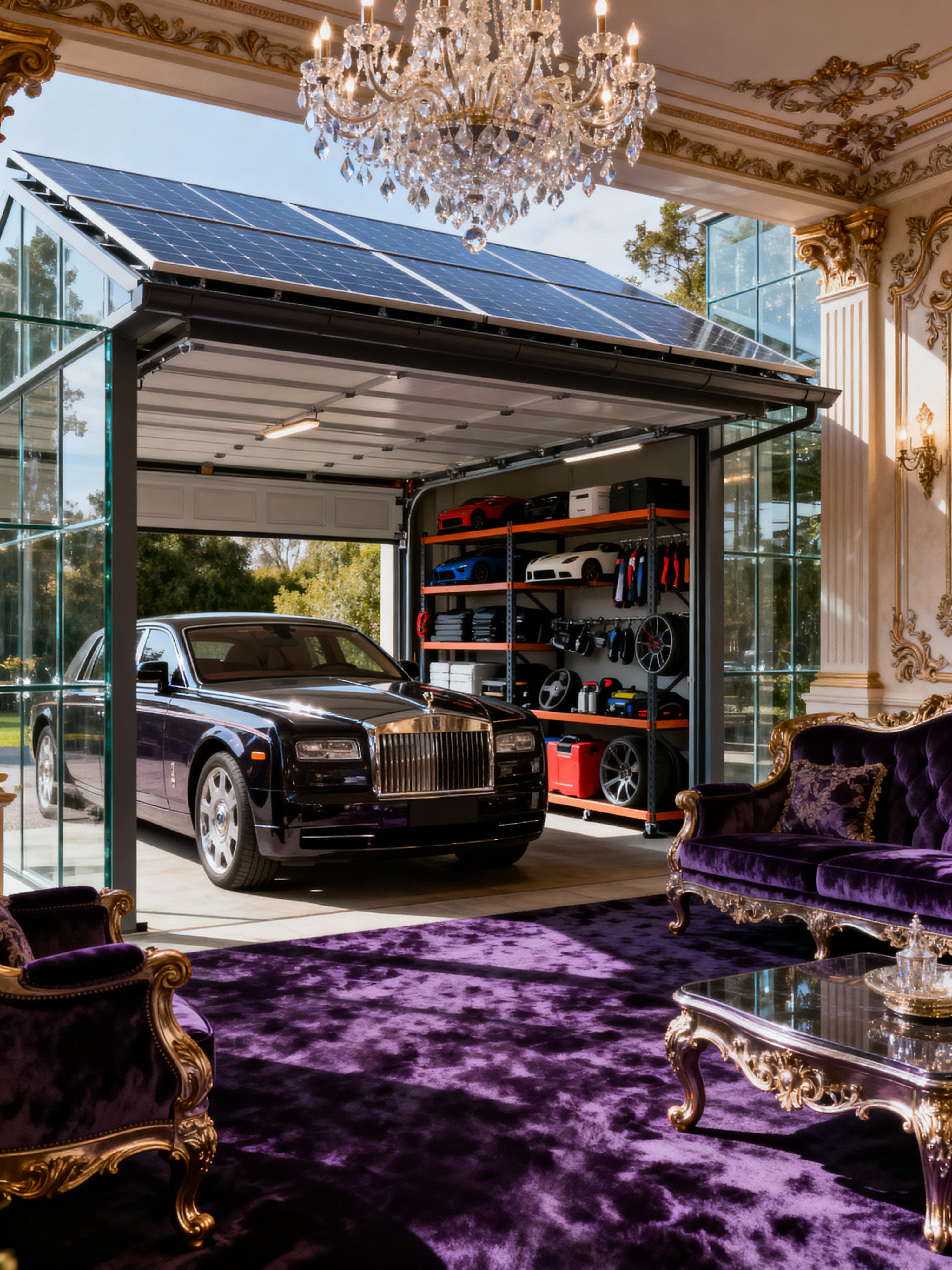 outdoor garage with baroque style with carport and cars and storage racks and carport roof and roof solar panels and canopy and carport. . with drama and crystal and glass accents and heavy moldings and grandeur and pedestal feet and expensive and plush flooring and tension and dynamism