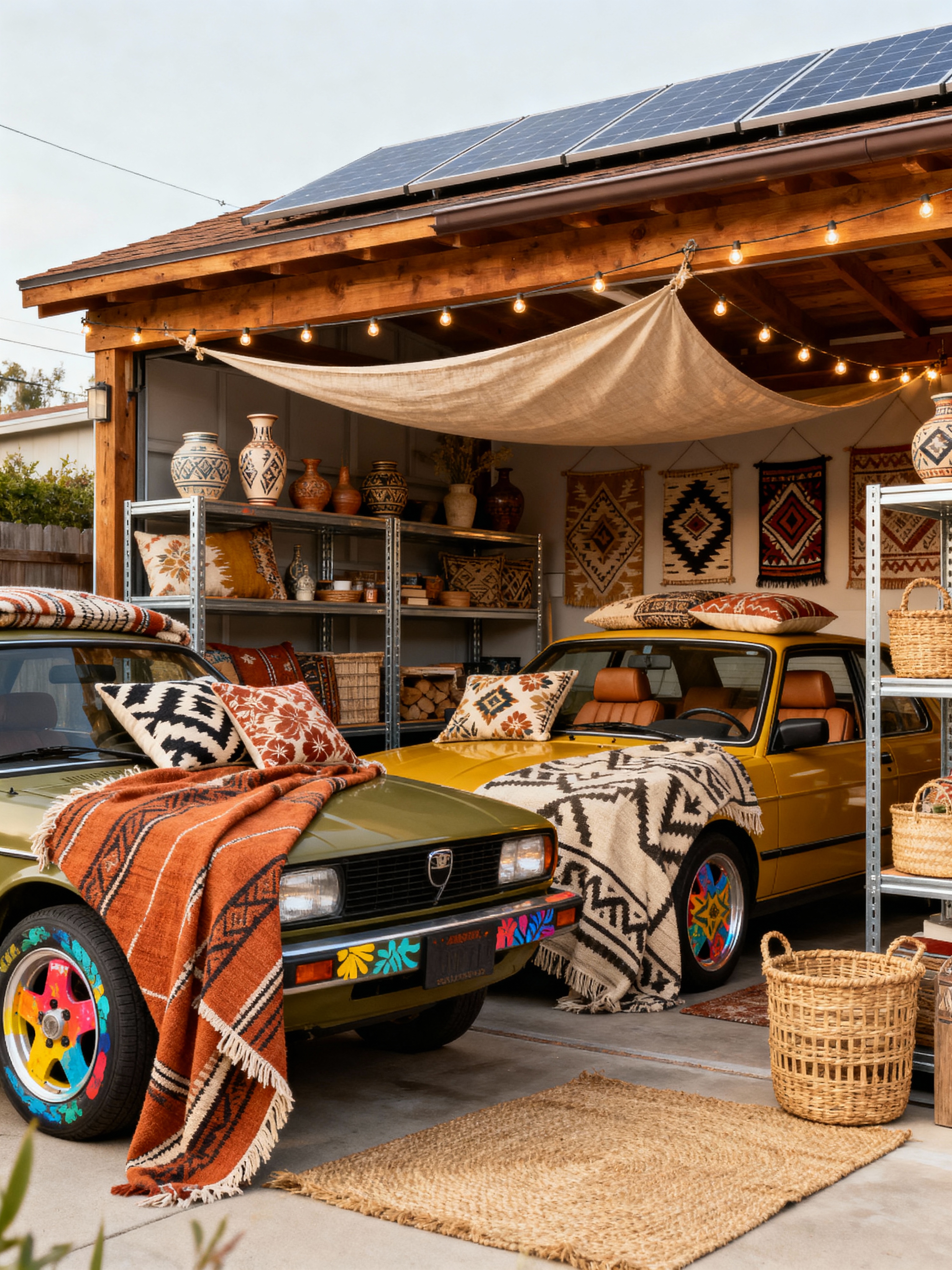 outdoor garage with boho-chic style with cars and storage racks and carport and roof solar panels and canopy and carport roof and cars. . with layered textiles and global artifacts and earthy colors and free-spirited and mixed patterns and artistic touches and natural materials and relaxed atmosphere