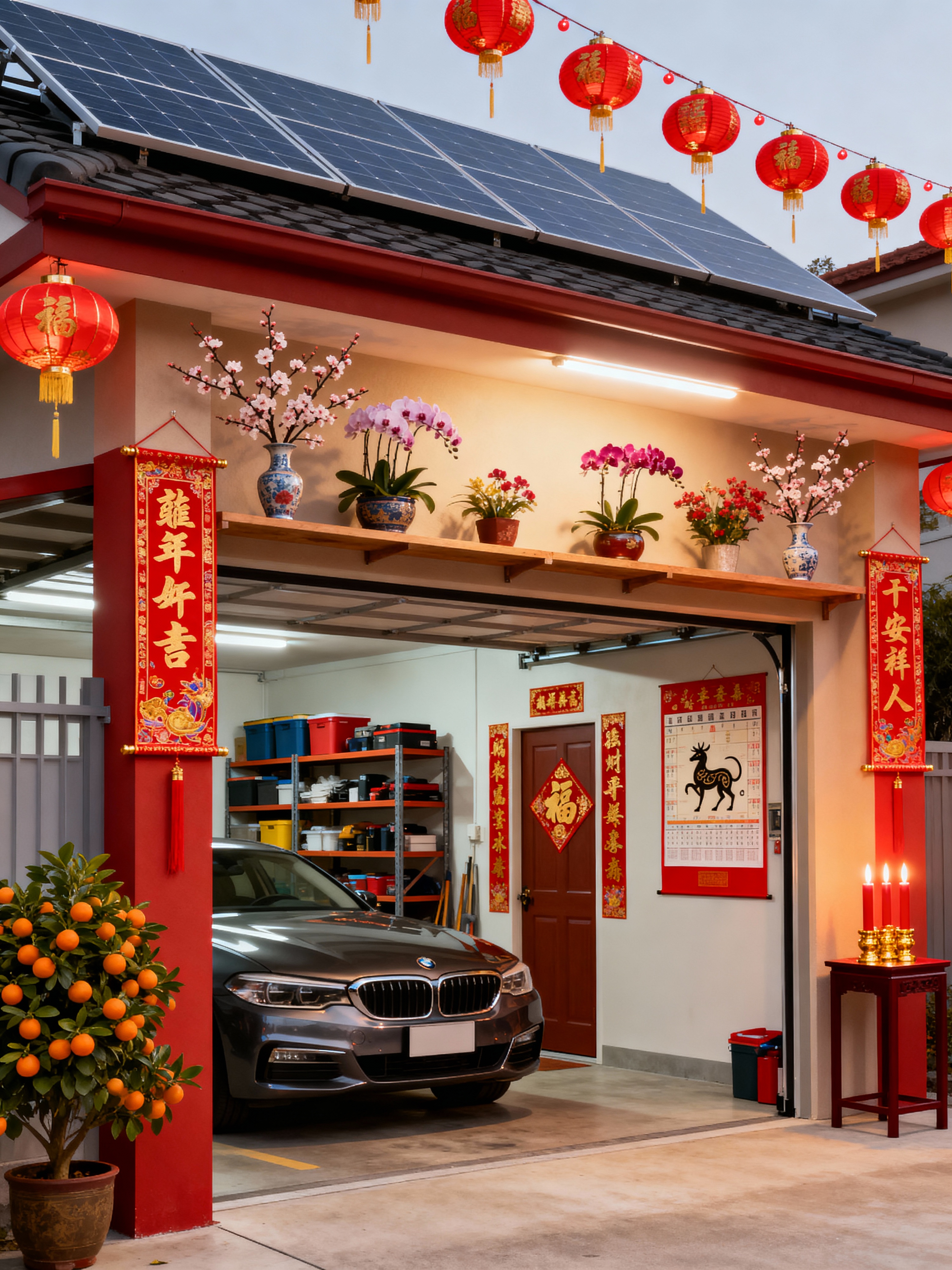 outdoor garage with chinese new year style with roof solar panels and cars and storage racks and carport roof and carport and canopy and roof solar panels. . with fai chun banners and chinese red lanterns and vases of plum blossoms and orchids and mei hwa flowers and kumquat trees and zodiac calendar and door couplets and red and gold candles