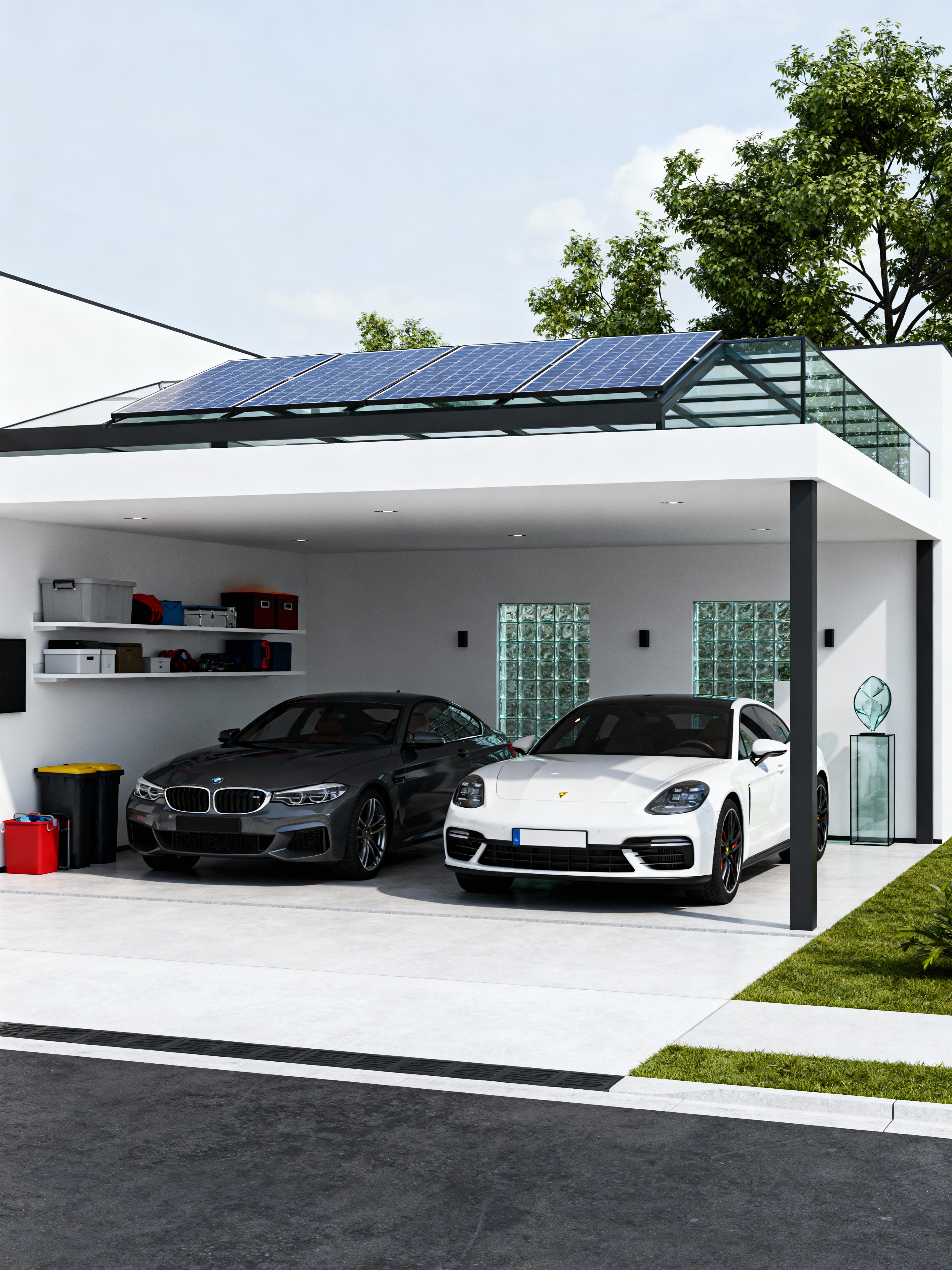 outdoor garage with contemporary style with carport roof and roof solar panels and canopy and cars and storage racks and carport and carport roof. . with glass decor and high contrast and clean look and sleek lines and neutral palette and modern finishes and minimalist and functional design