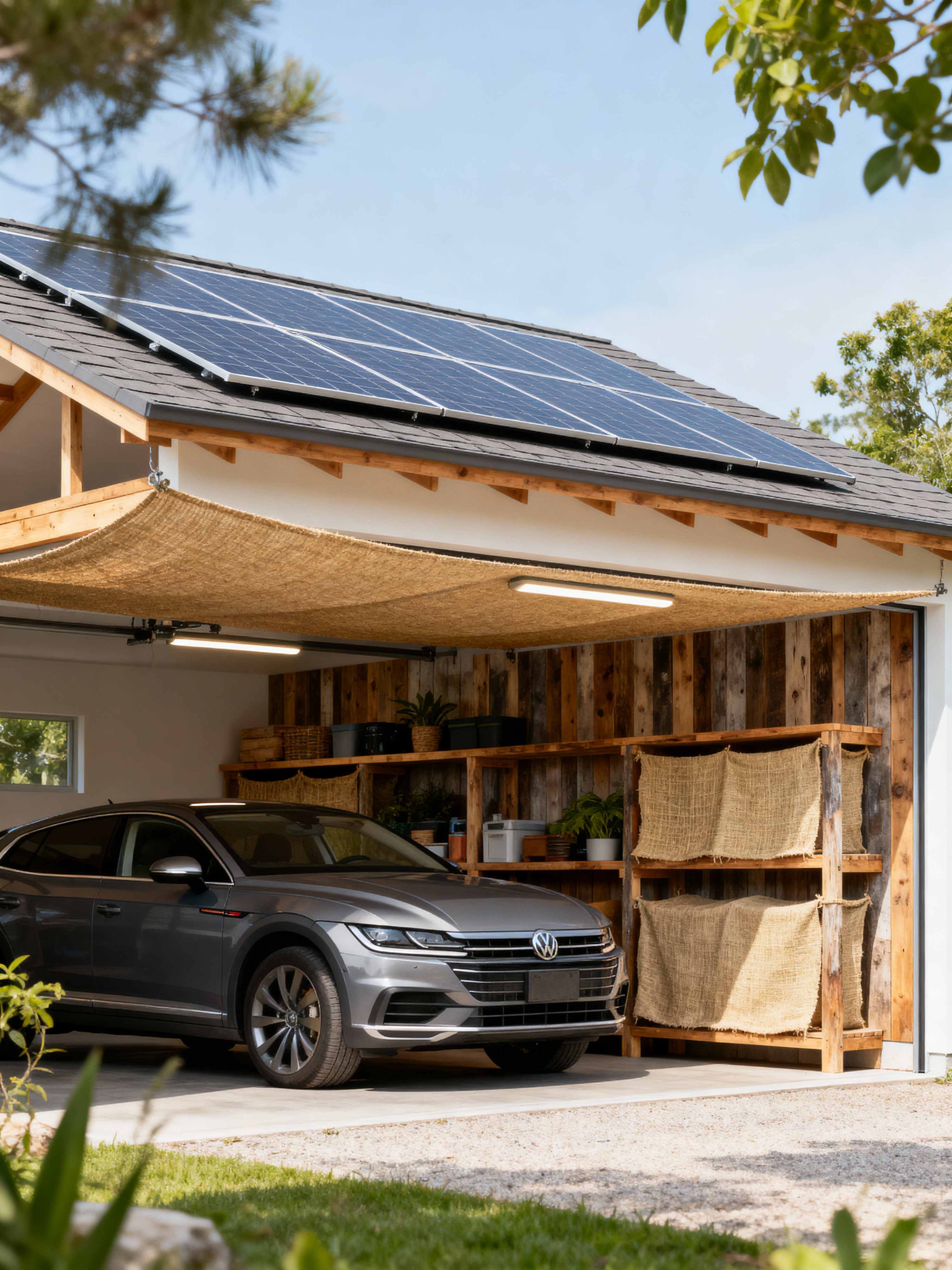 outdoor garage with eco-friendly style with carport roof and roof solar panels and carport and cars and storage racks and canopy and carport roof. . with recycled elements and sustainable materials and natural fibers and environmentally conscious and energy efficient and reclaimed wood and organic textiles and non-toxic finishes