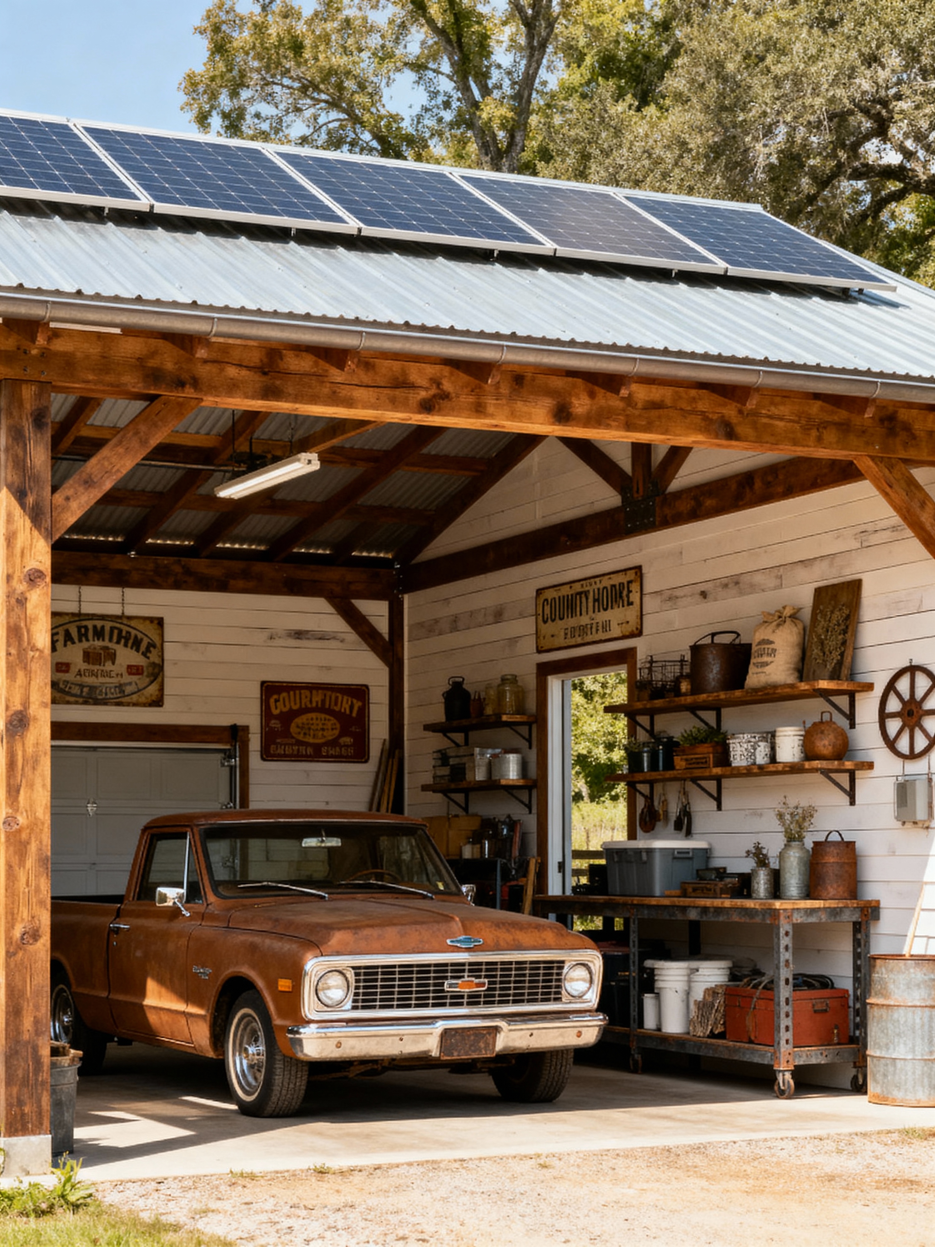 outdoor garage with farmhouse style with canopy and carport and roof solar panels and storage racks and cars and carport roof and canopy. . with open shelving and shiplap walls and rustic charm and natural textures and exposed wood and country style and vintage decor and industrial accents