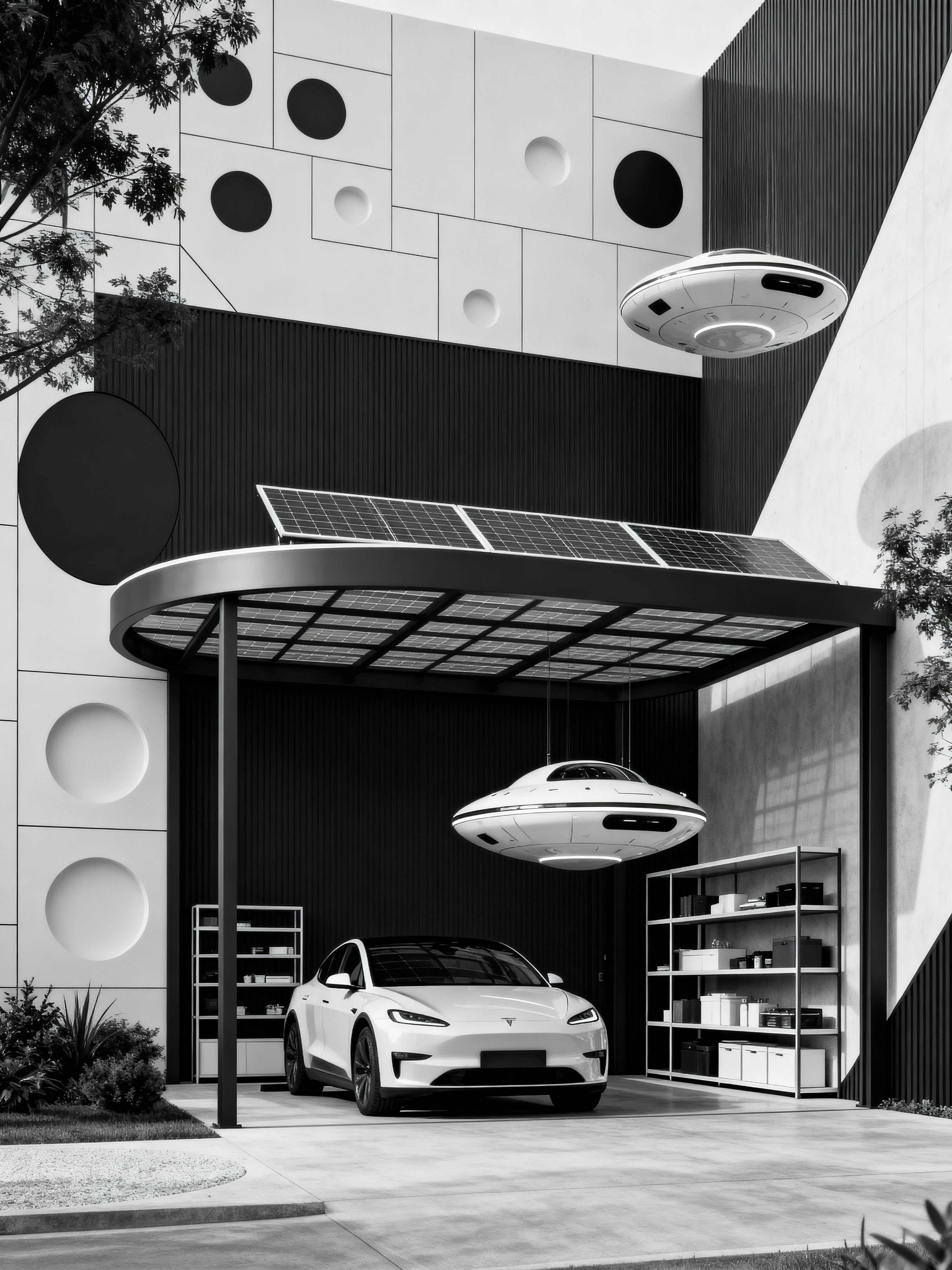 outdoor garage with futuristic style with carport and storage racks and carport roof and cars and roof solar panels and canopy and carport. . with circular shapes and steel finishing and futurism minimalist and strong geometric walls and spaceship and monochromatic palette and floating surfaces and minimalist clean lines
