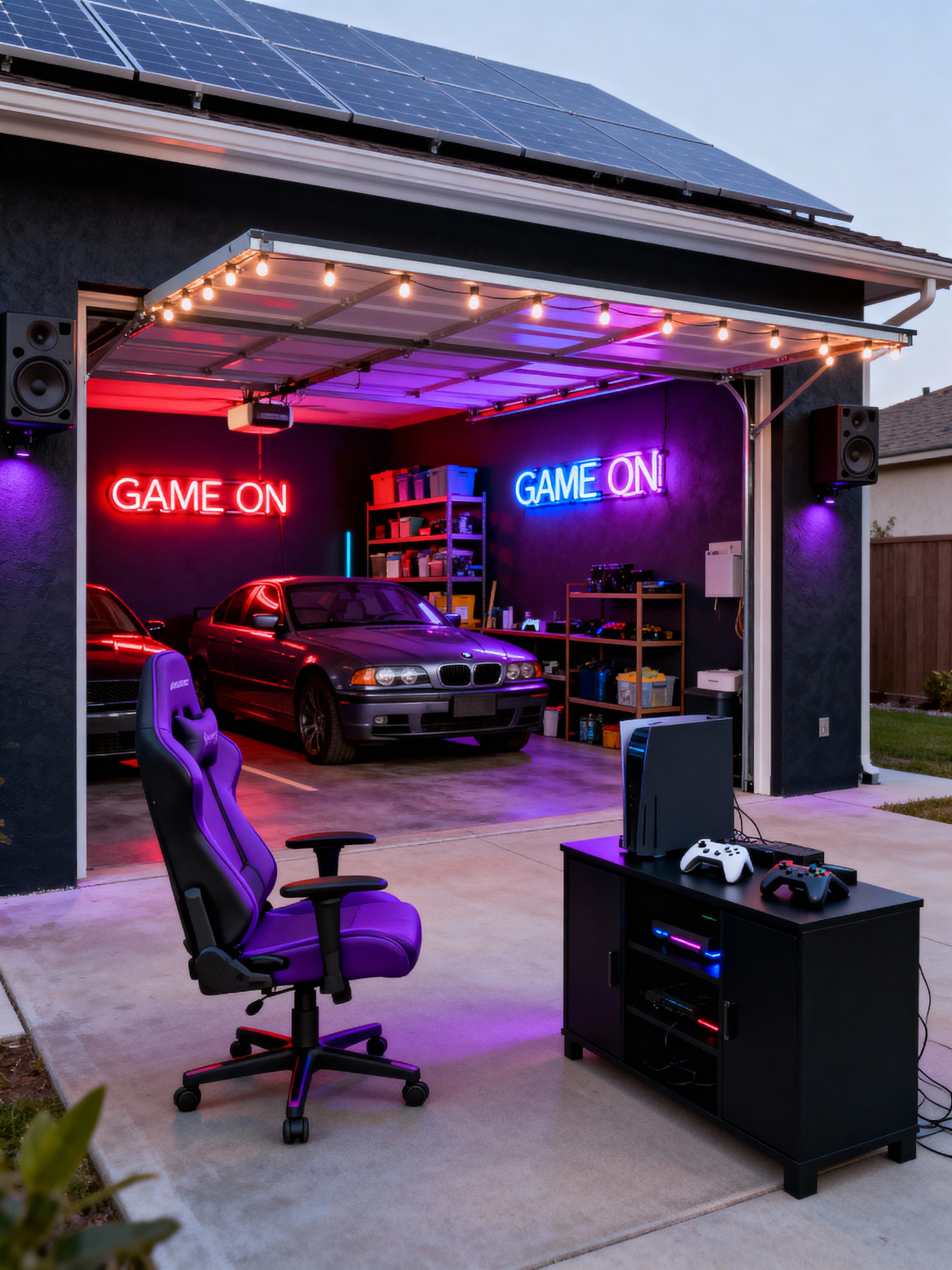 outdoor garage with gaming room style with canopy and roof solar panels and cars and carport and storage racks and carport roof and canopy. . with speakers and neon letters on wall and neon lights and gaming chair and dark walls and purple and red lights and purple, red and blue fade light and video game consoles
