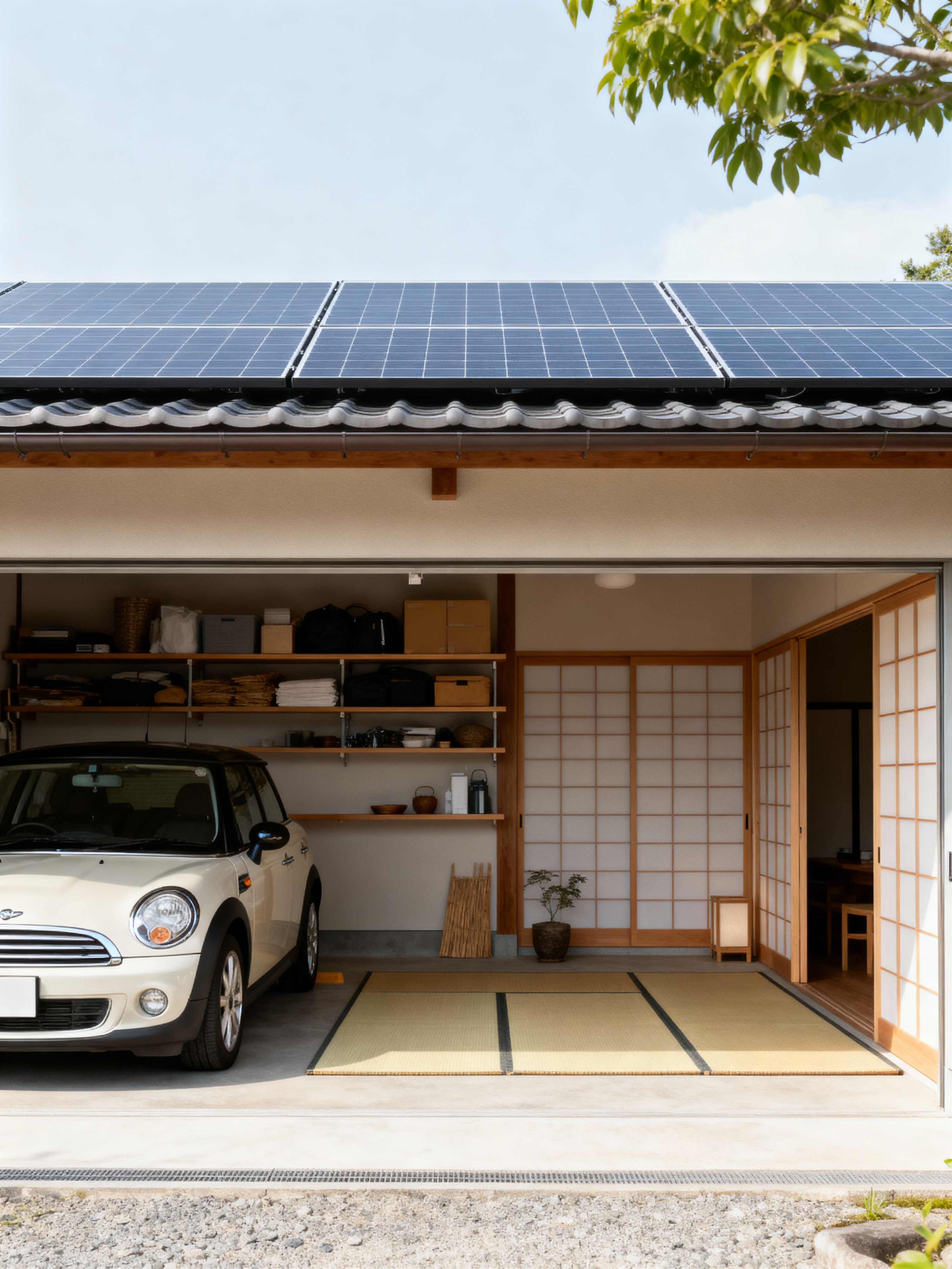 outdoor garage with japanese design style with carport and carport roof and storage racks and canopy and roof solar panels and cars and carport. . with tatami mats and minimalism and tranquility and zen decor and natural materials and sliding doors and wabi-sabi and neutral colors