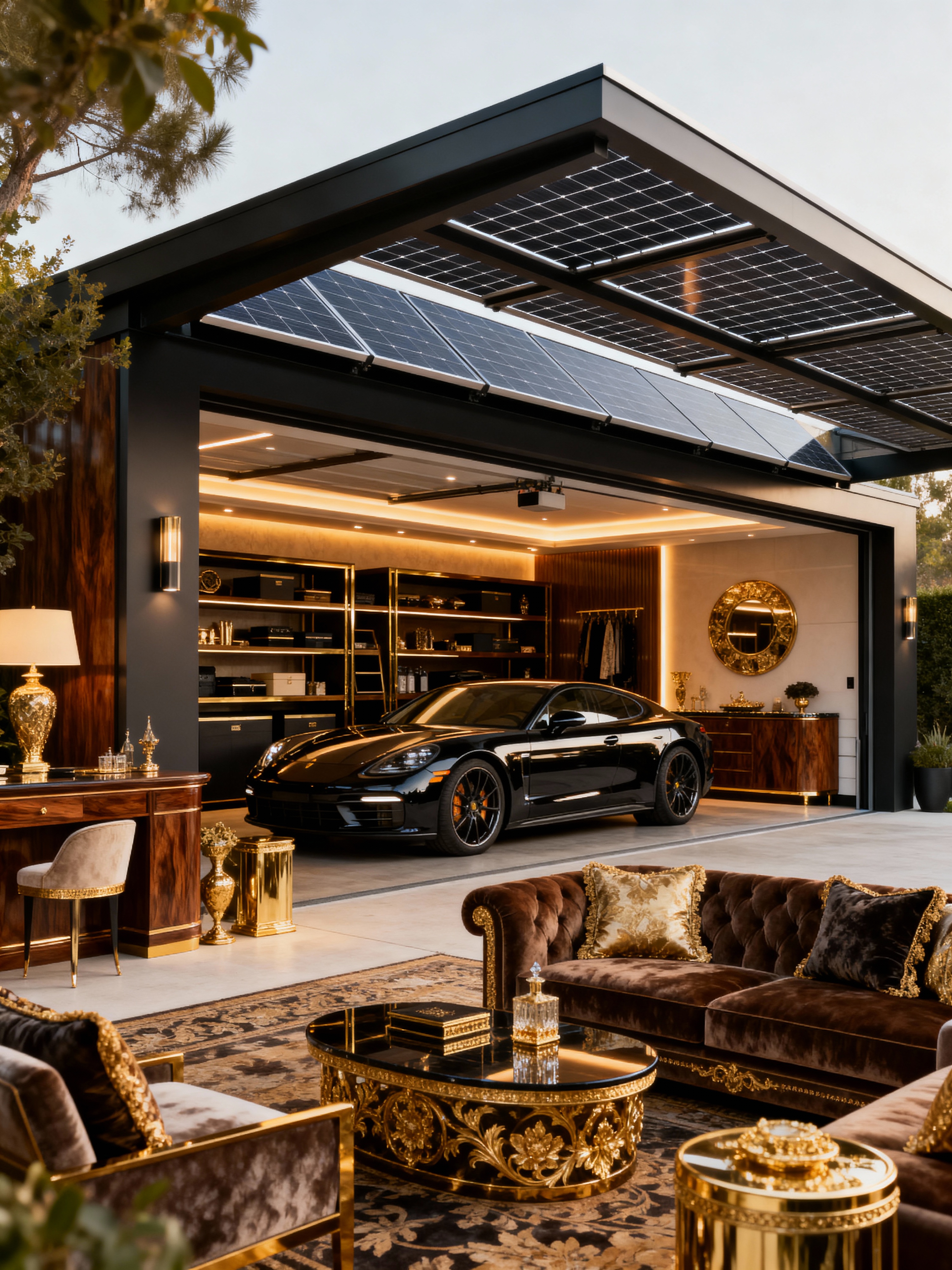 outdoor garage with luxury style with carport roof and storage racks and cars and canopy and roof solar panels and carport and carport roof. . with exclusive design and rich textures and expensive fabrics and premium finishes and sophisticated style and custom pieces and lavish comfort and opulent details