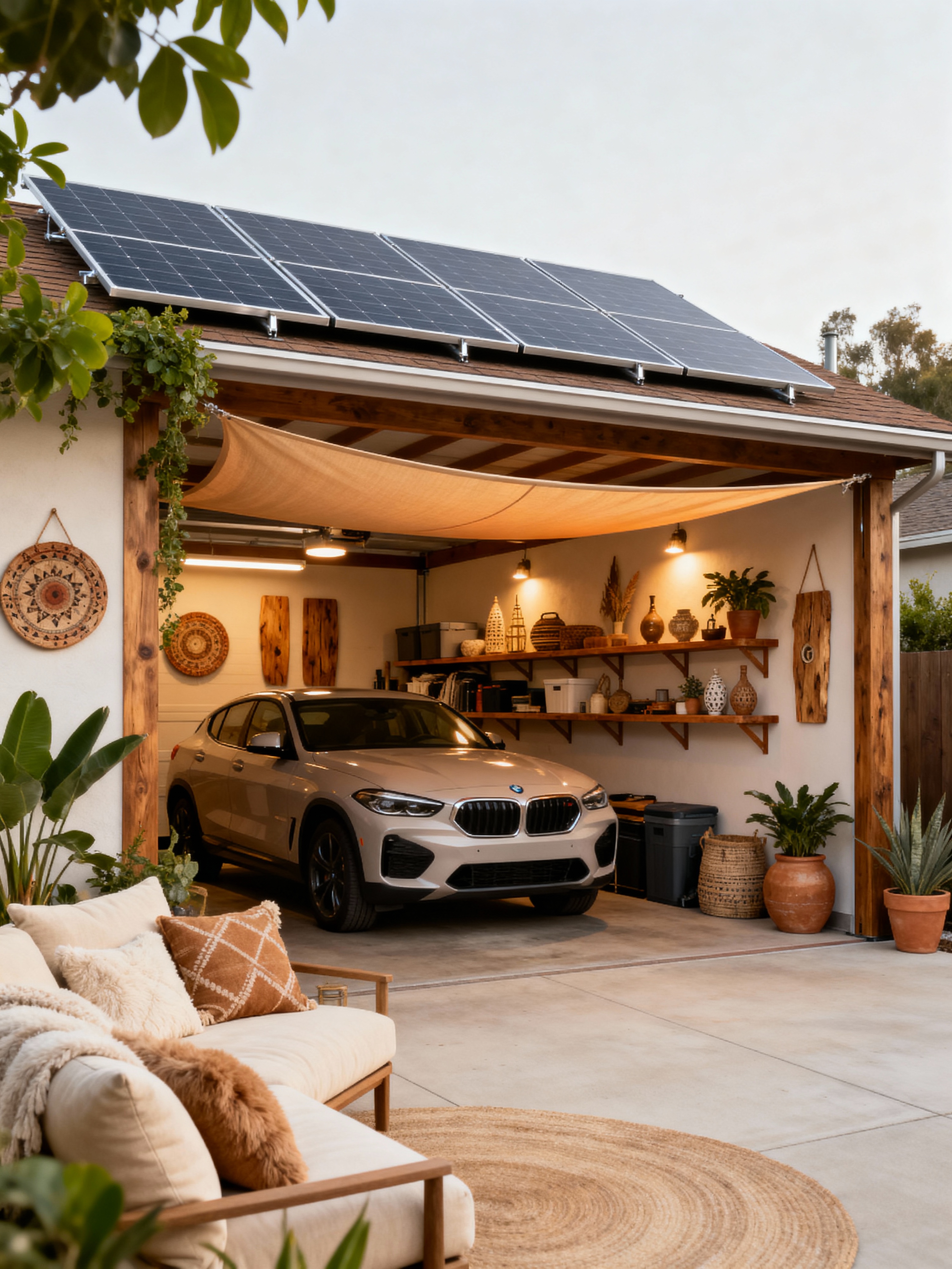 outdoor garage with modern boho style with roof solar panels and canopy and storage racks and carport and cars and carport roof and roof solar panels. . with greenery and unique finds and wood decor and potted plants and eclectic style and neutral palette and comfortable and cozy feel