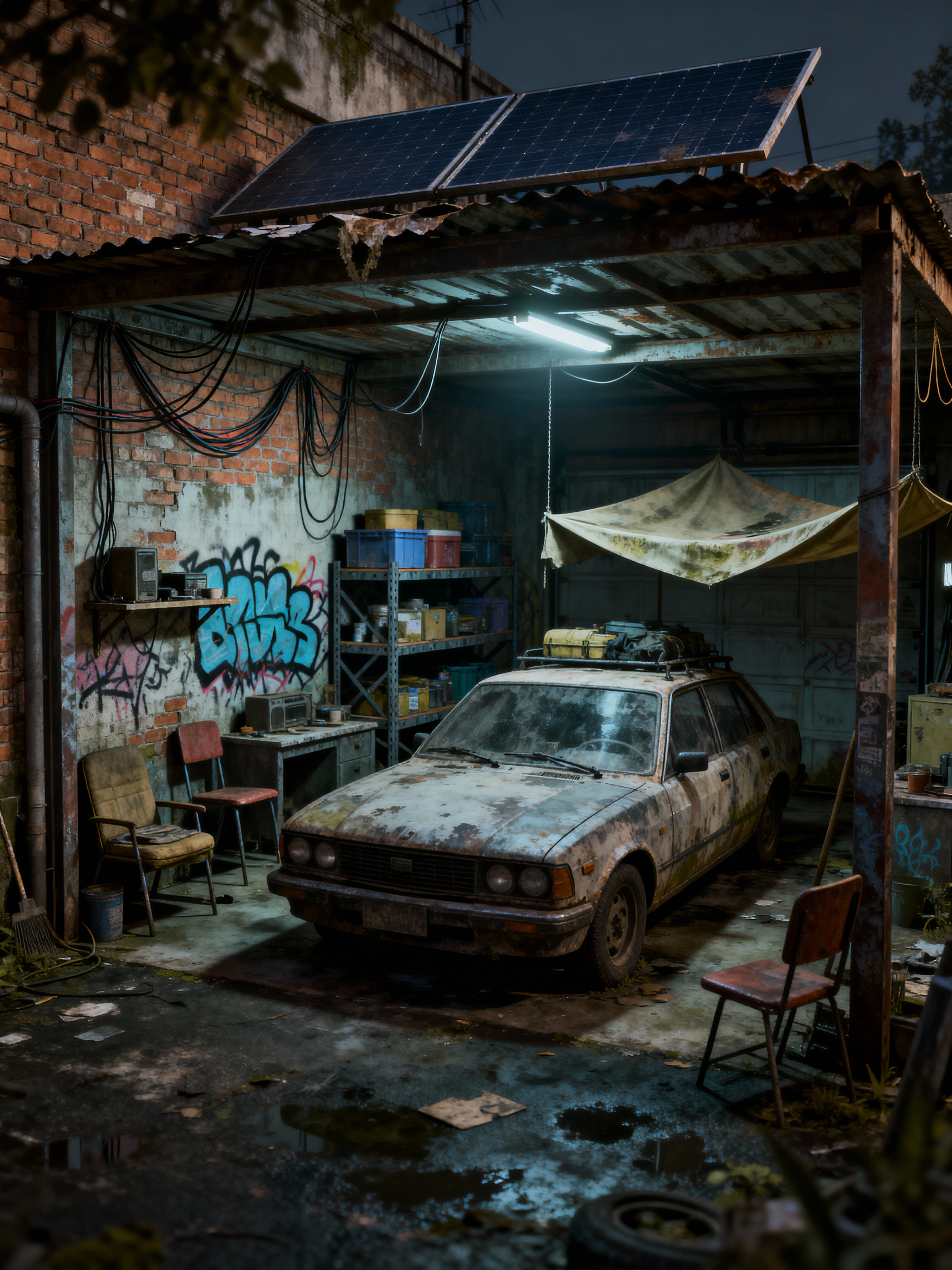 outdoor garage with post-apocalyptic style with cars and carport and carport roof and storage racks and roof solar panels and canopy and cars. . with exposed bricks and survival-inspired and neglected atmosphere and weathered materials and dim lighting and hanging exposed wires and graffiti on walls and cheap mismatched furniture