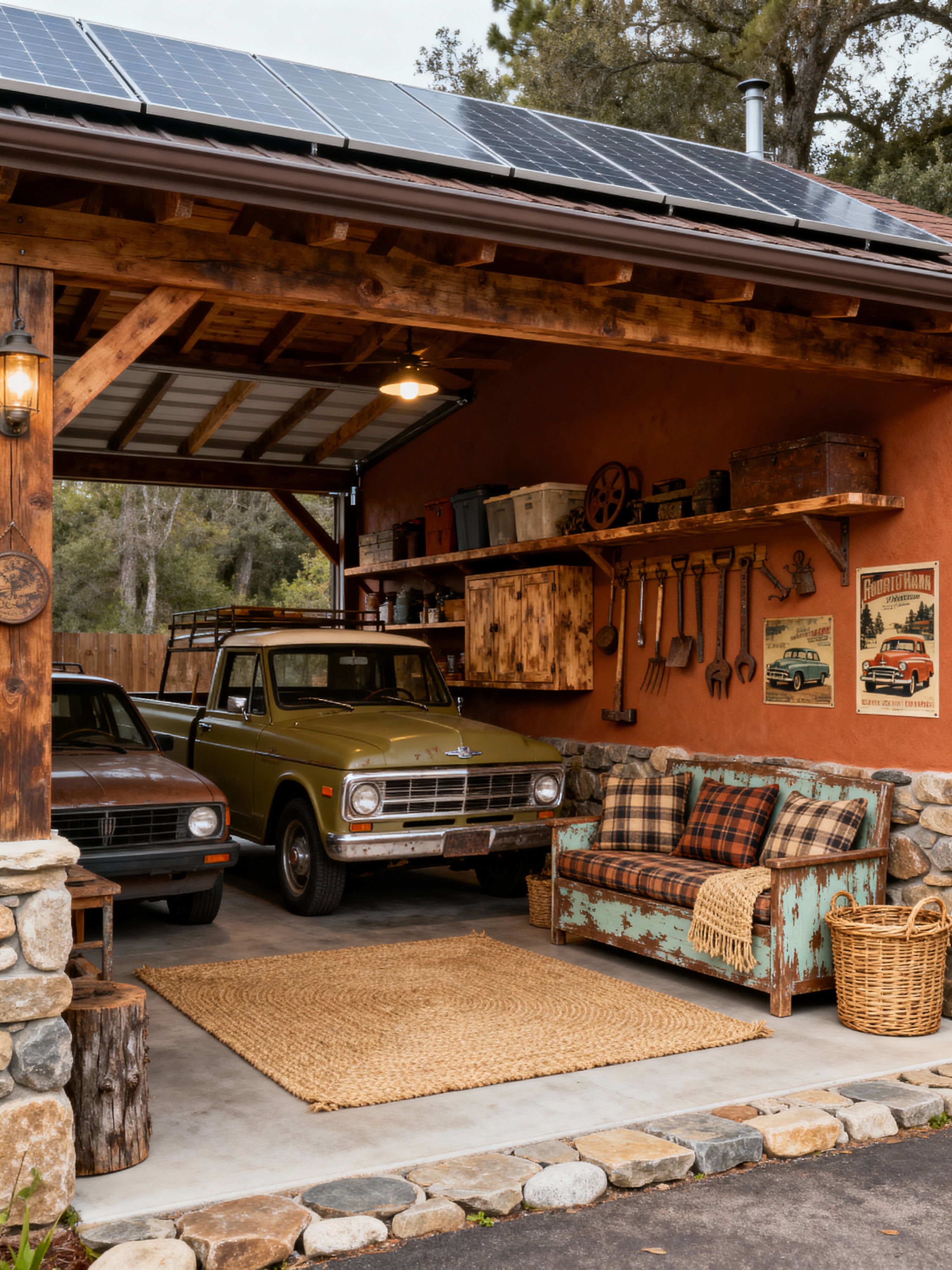 outdoor garage with rustic style with roof solar panels and canopy and carport and carport roof and cars and storage racks and roof solar panels. . with stone accents and earthy tones and natural wood and vintage decor and woven textures and country style and distressed finishes and cozy cabin