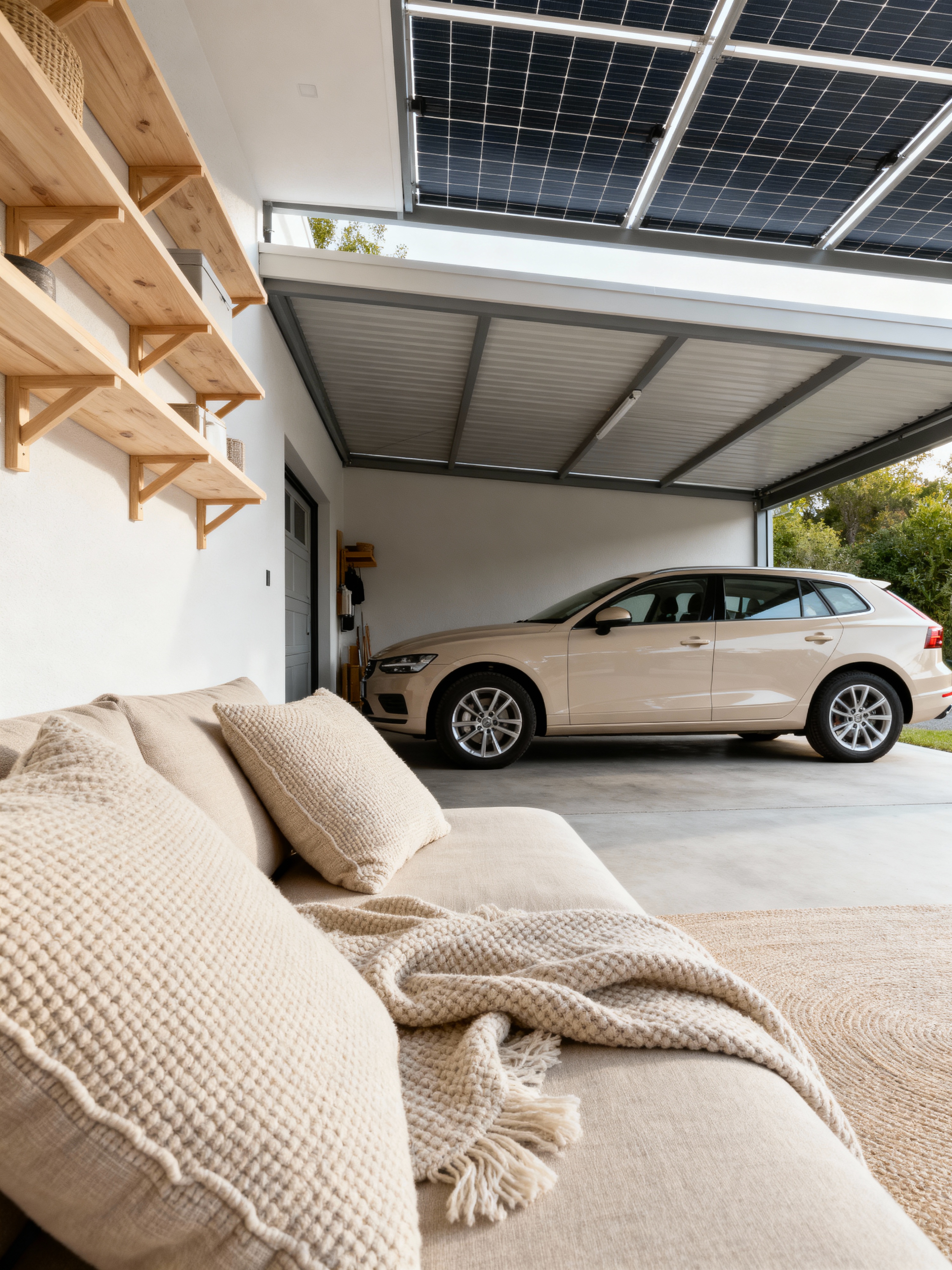 outdoor garage with scandinavian style with canopy and carport and roof solar panels and cars and carport roof and storage racks and canopy. . with neutral palette and natural light and clean lines and textured fabrics and light wood and simple elegance and minimalist design and cozy atmosphere