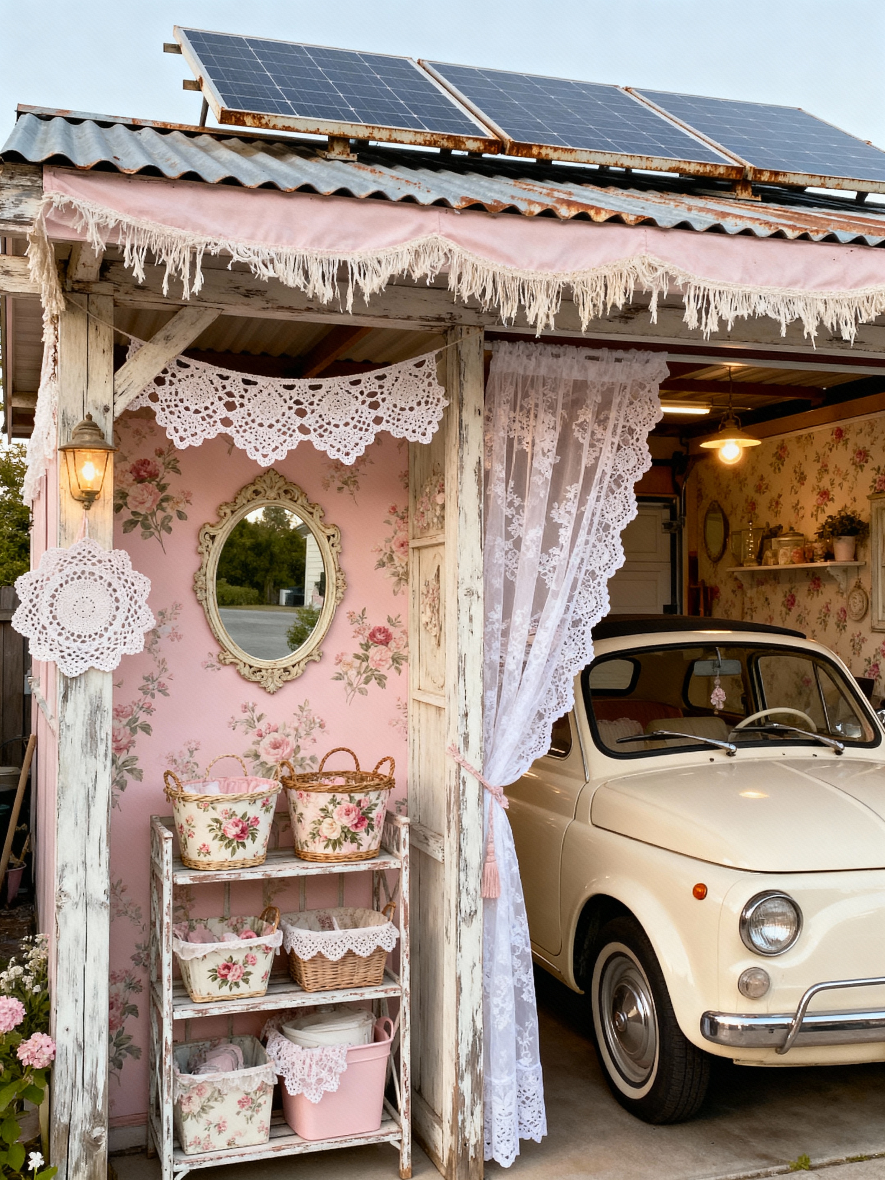 outdoor garage with shabby chic style with canopy and carport roof and cars and storage racks and carport and roof solar panels and canopy. . with weathered finishes and vintage charm and feminine touches and soft textures and floral patterns and antique lace and romantic style and delicate details