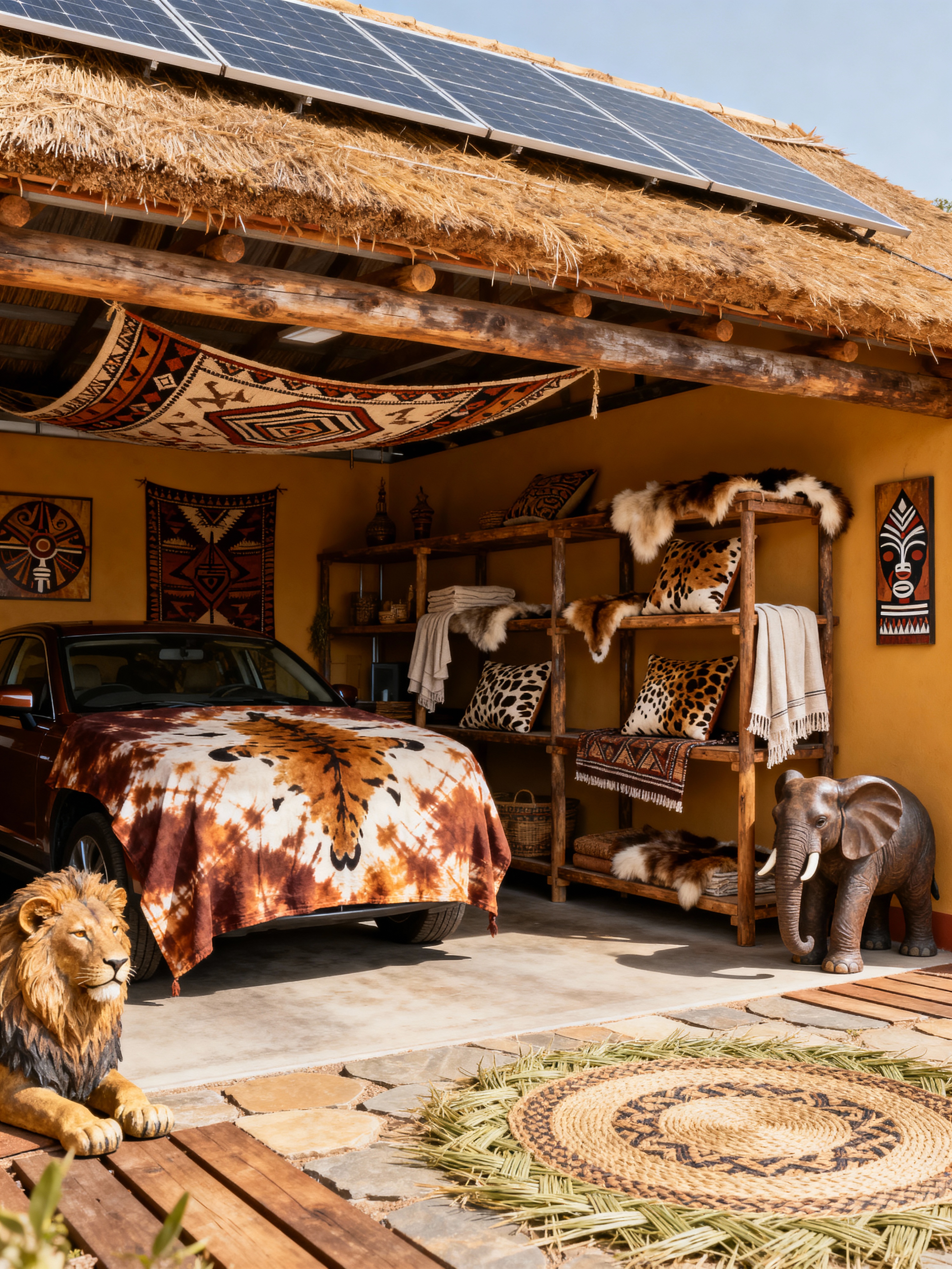 outdoor garage with tribal style with storage racks and cars and carport roof and roof solar panels and carport and canopy and storage racks. . with animal prints and sculptures and artworks and hand dyed batik fabrics and tribal patterns and animal furslinen and smooth worn timbers and planks of stone and intricate grass weaving