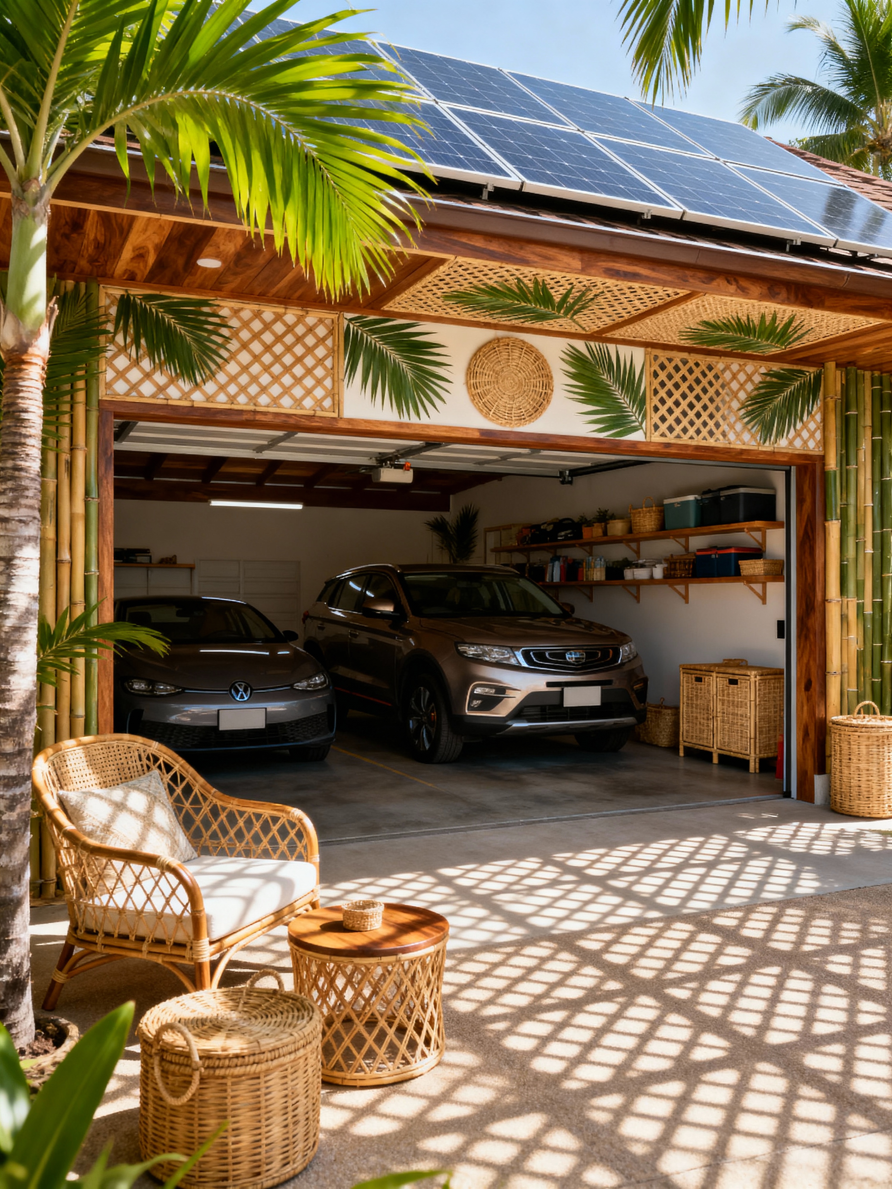 outdoor garage with tropical style with carport and cars and canopy and storage racks and roof solar panels and carport roof and carport. . with palm leaves and lattice prints and rattan and teak and palm trees and bamboo and wicker and cane motifs