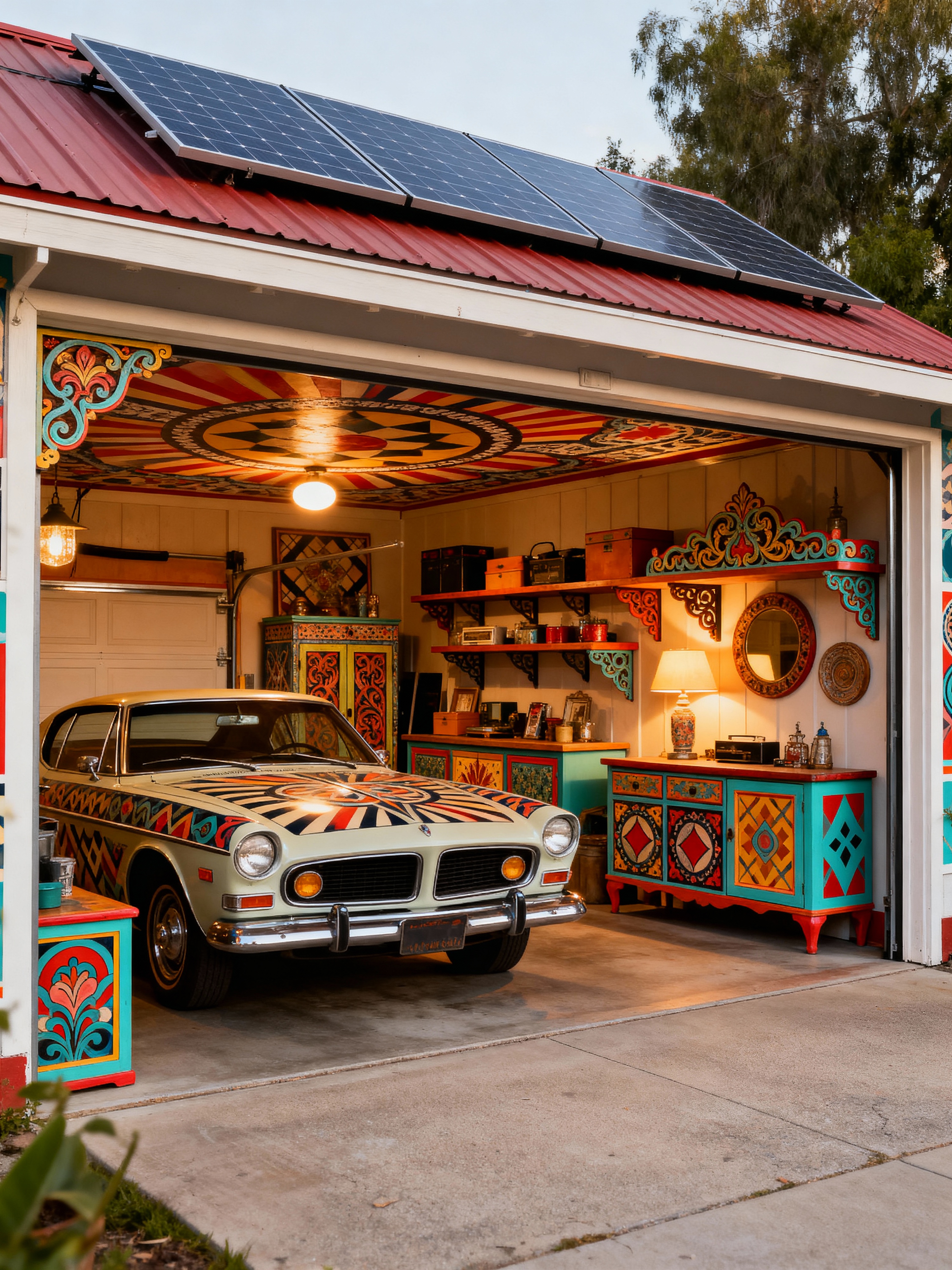 outdoor garage with vintage style with roof solar panels and storage racks and cars and carport and canopy and carport roof and roof solar panels. . with ornate details and retro style and upcycled furniture and colorful accents and timeless pieces and nostalgic feel and eclectic and bold patterns