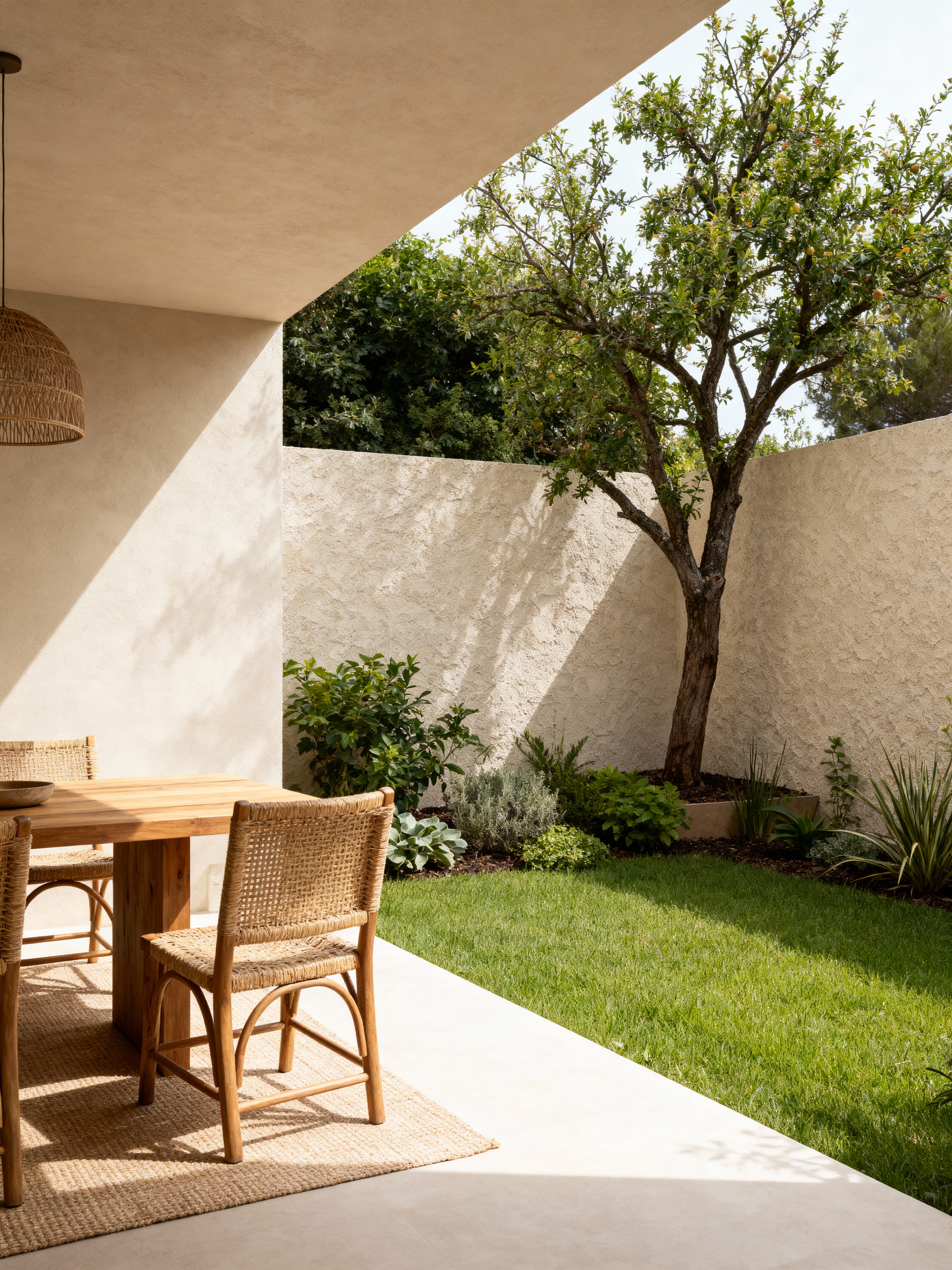outdoor garden with airbnb style with garden plants and garden tree and grass and garden plants. . with scandinavian style and neutral walls and textures and simple color palette and practicality and functionality and open and natural lighting and simple, clean lines and simplistic furniture and natural materials and elements and scandinavian style