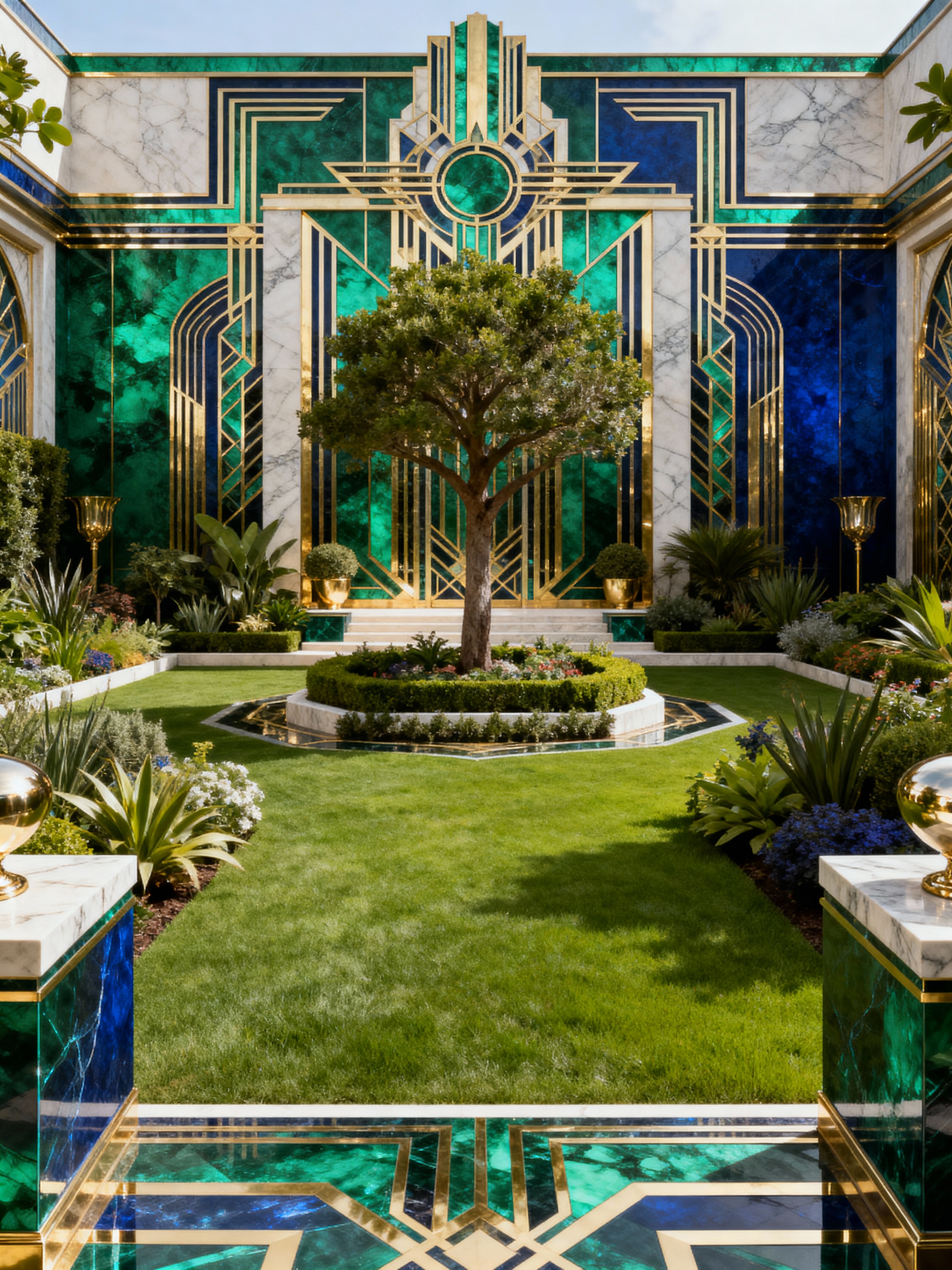 outdoor garden with art deco style with grass and garden plants and garden tree and grass. . with geometric lines and geometric shapes and decadent detail and abstract patterns and glamour and bold geometry and smooth lines and exuberant shapes