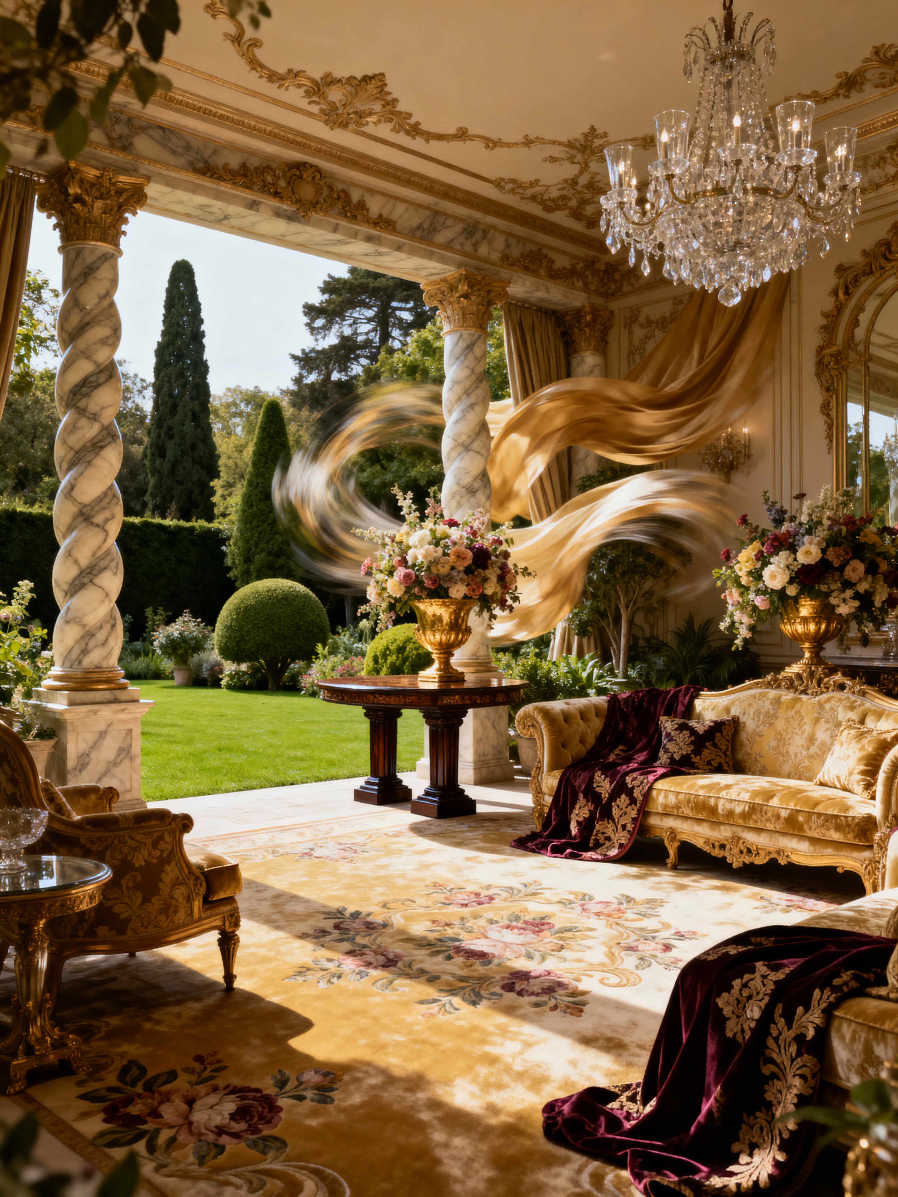 outdoor garden with baroque style with grass and garden plants and garden tree and grass. . with movement and pedestal feet and expensive and plush flooring and twisted columns and opulent and colossal furniture and crystal and glass accents and dynamism and luxurious floral and damask fabrics