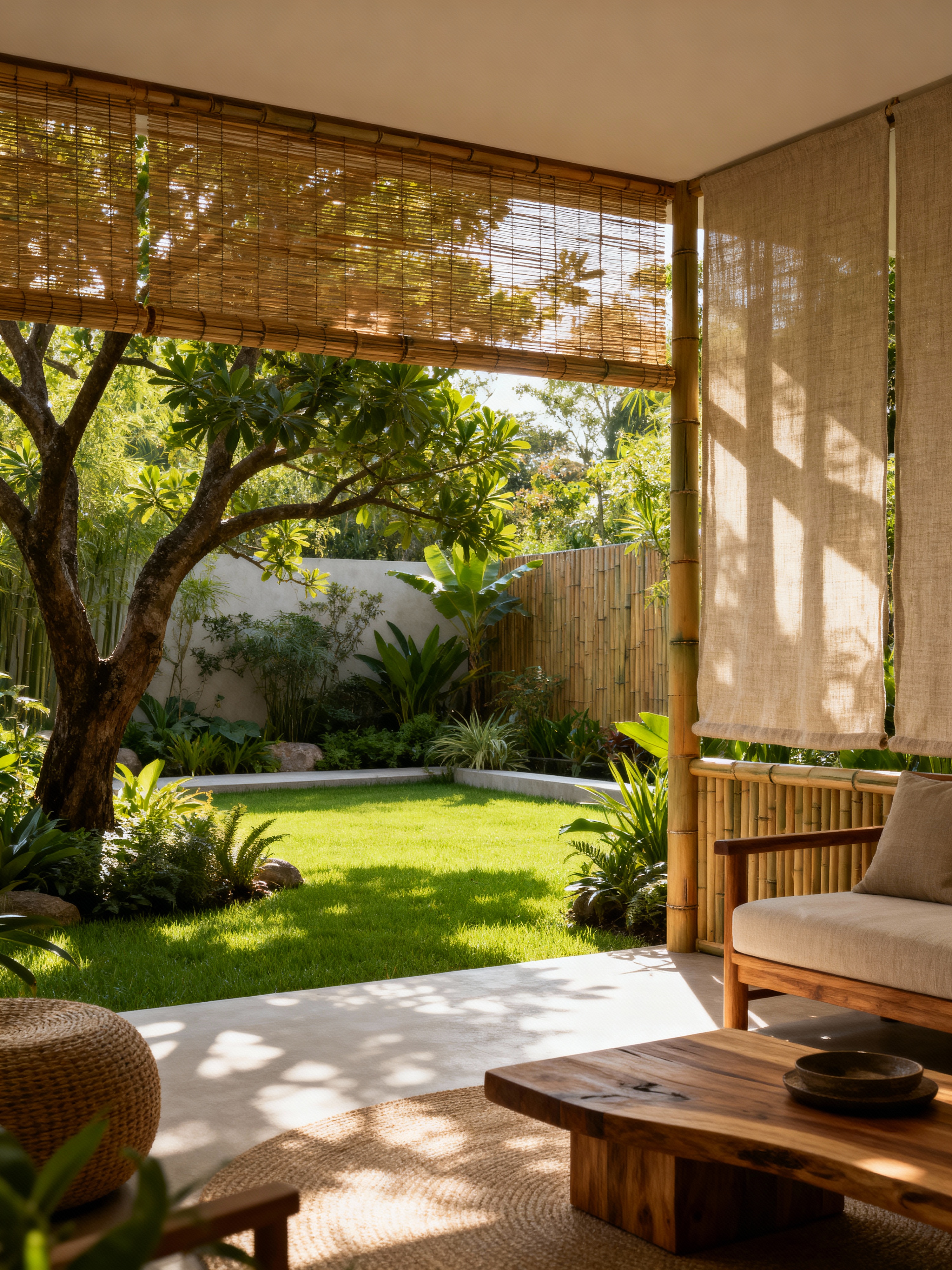 outdoor garden with biophilic style with garden tree and garden plants and grass and garden tree. . with linen materials and features of the natural world and bamboo materials and wood materials and sunlight and natural shapes and forms and plants and environmental features