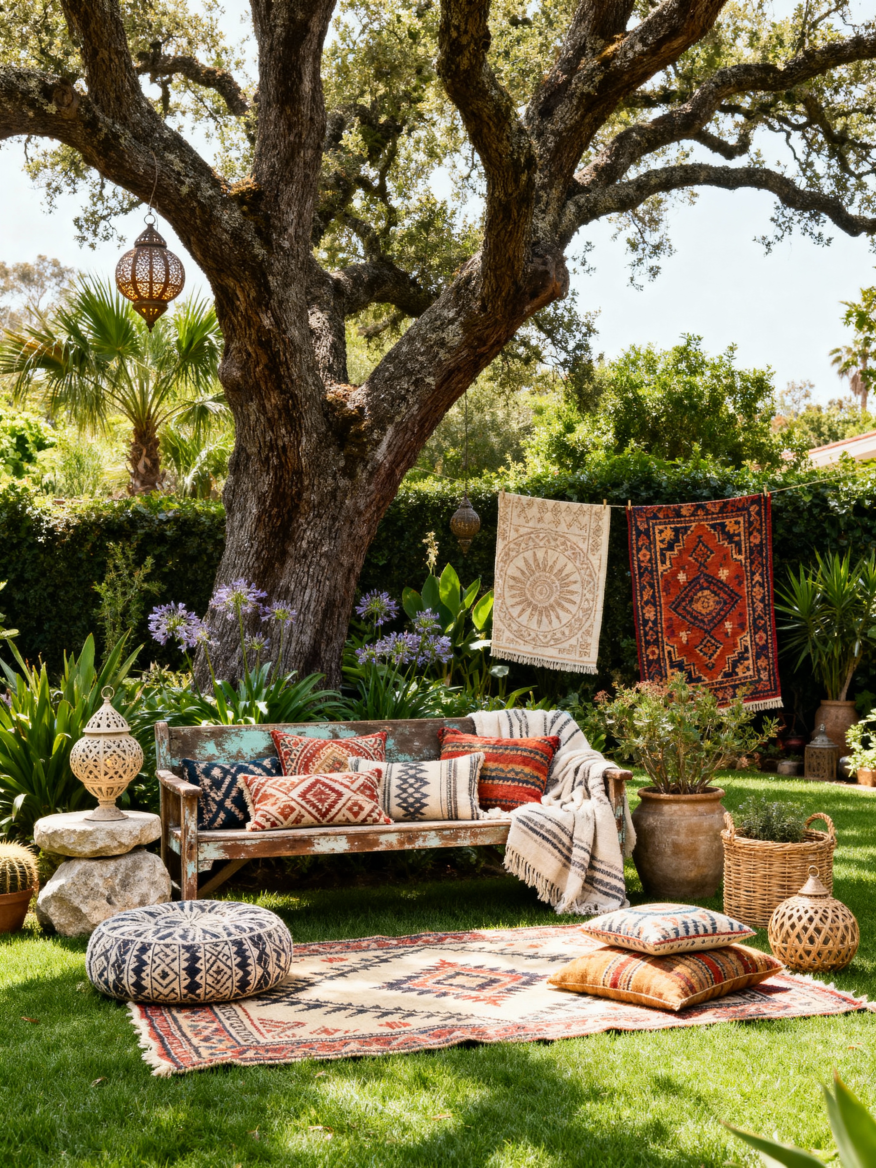 outdoor garden with boho-chic style with garden tree and grass and garden plants and garden tree. . with artistic touches and layered textiles and vintage finds and relaxed atmosphere and natural materials and global artifacts and eclectic mix and bohemian flair
