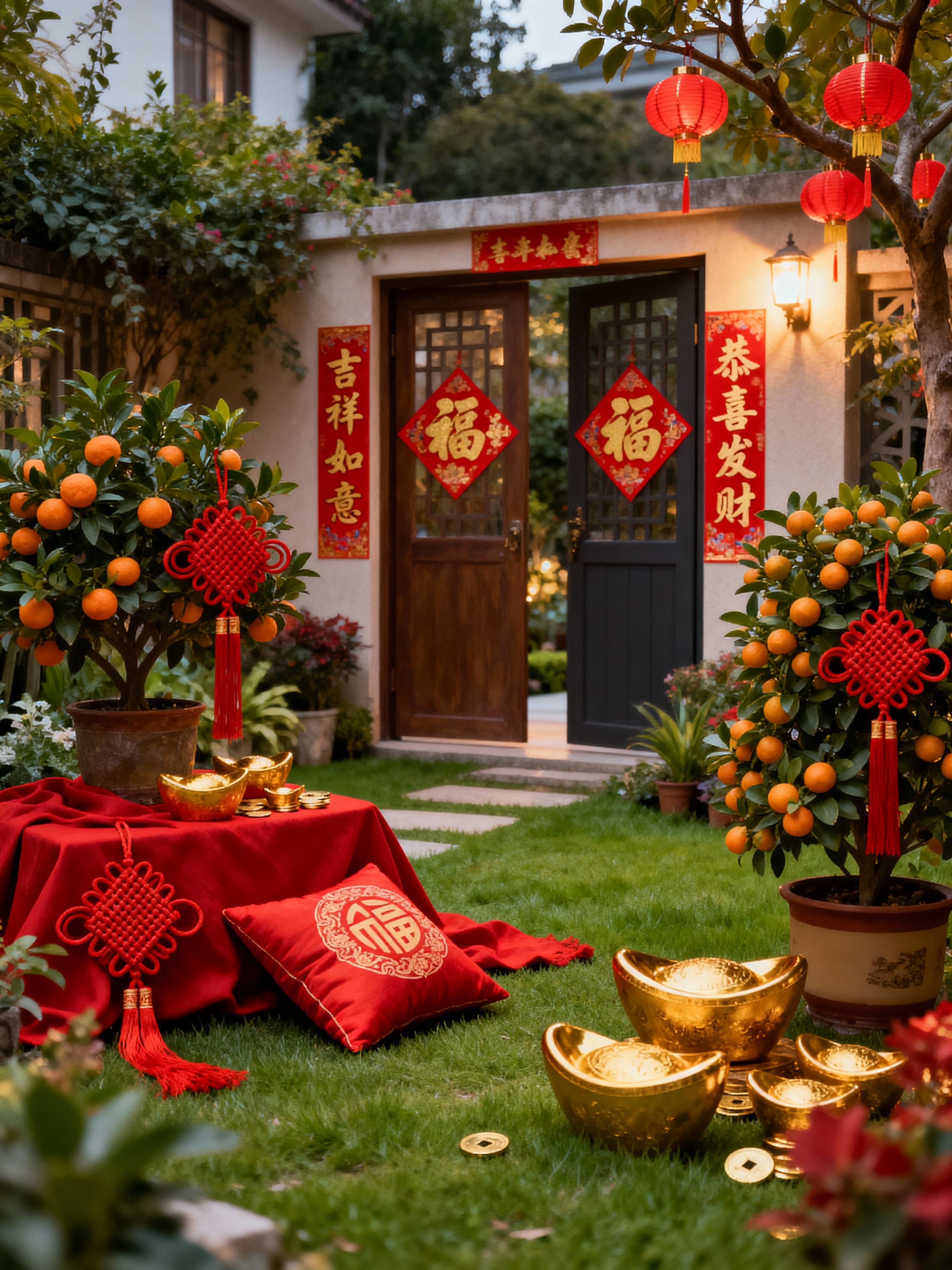 outdoor garden with chinese new year style with garden plants and garden tree and grass and garden plants. . with orange trees and chinese knots and money tree and door couplets and chinese red lanterns and kumquat trees and red fabric & pillows and gold ingots