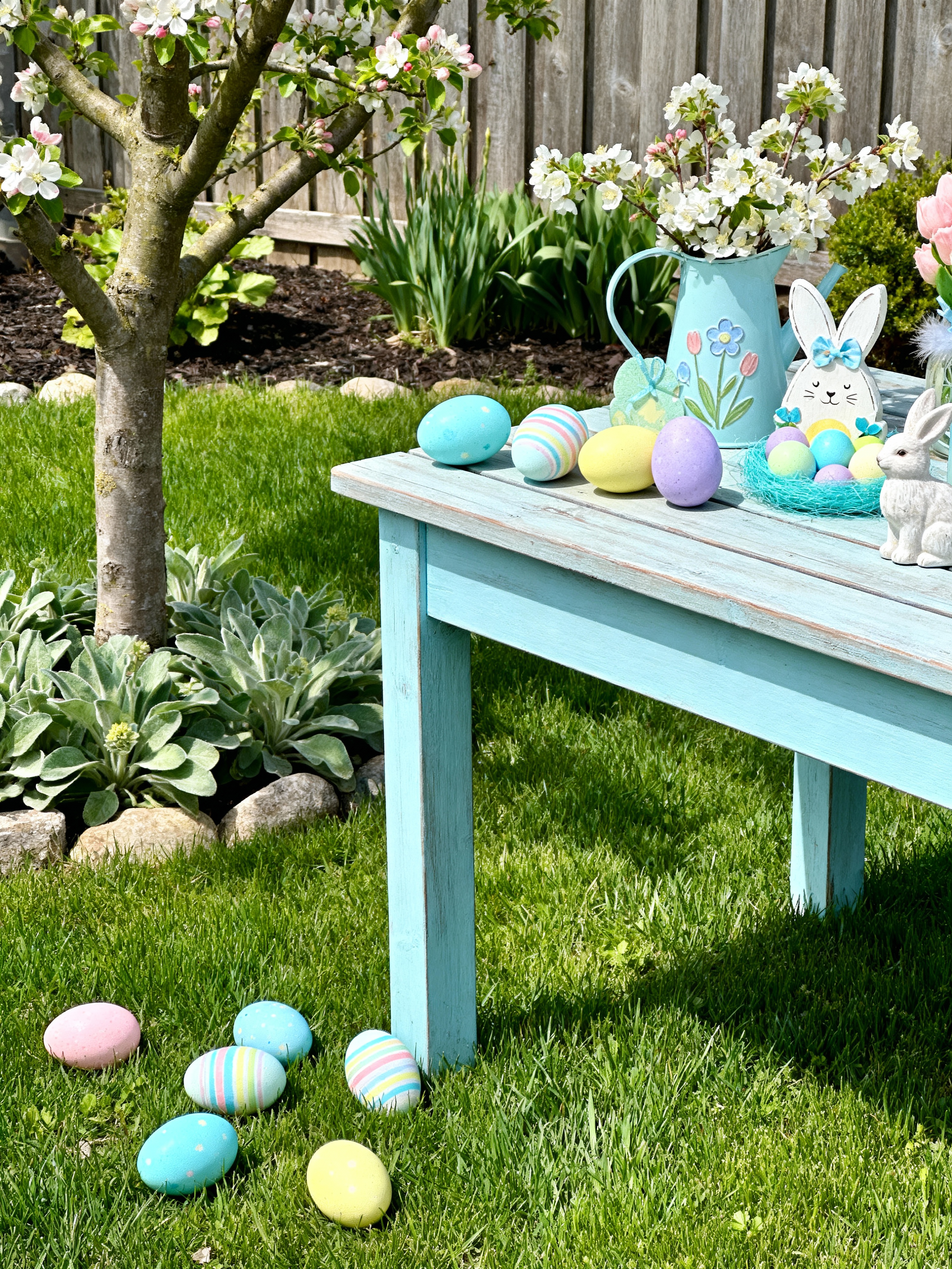 outdoor garden with easter style with garden plants and grass and garden tree and garden plants. . with colorful easter eggs and light blue colors and spring decorations and flowers on table and easter decorations and colorful easter eggs