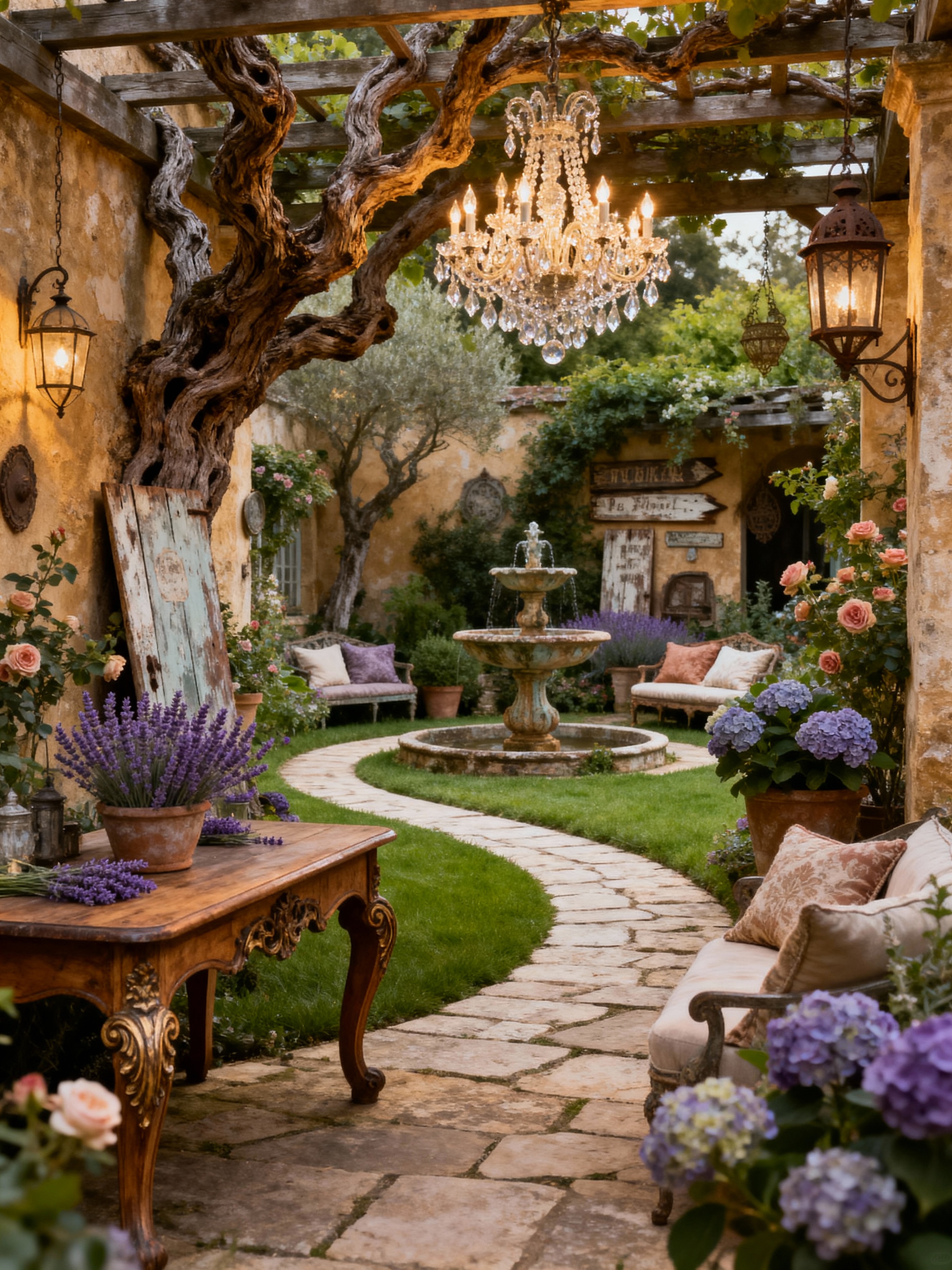 outdoor garden with french country style with garden tree and grass and garden plants and garden tree. . with ornate details and textured walls and vintage furniture and chandeliers and warm tones and elegant rustic and antique decor and lavender accents