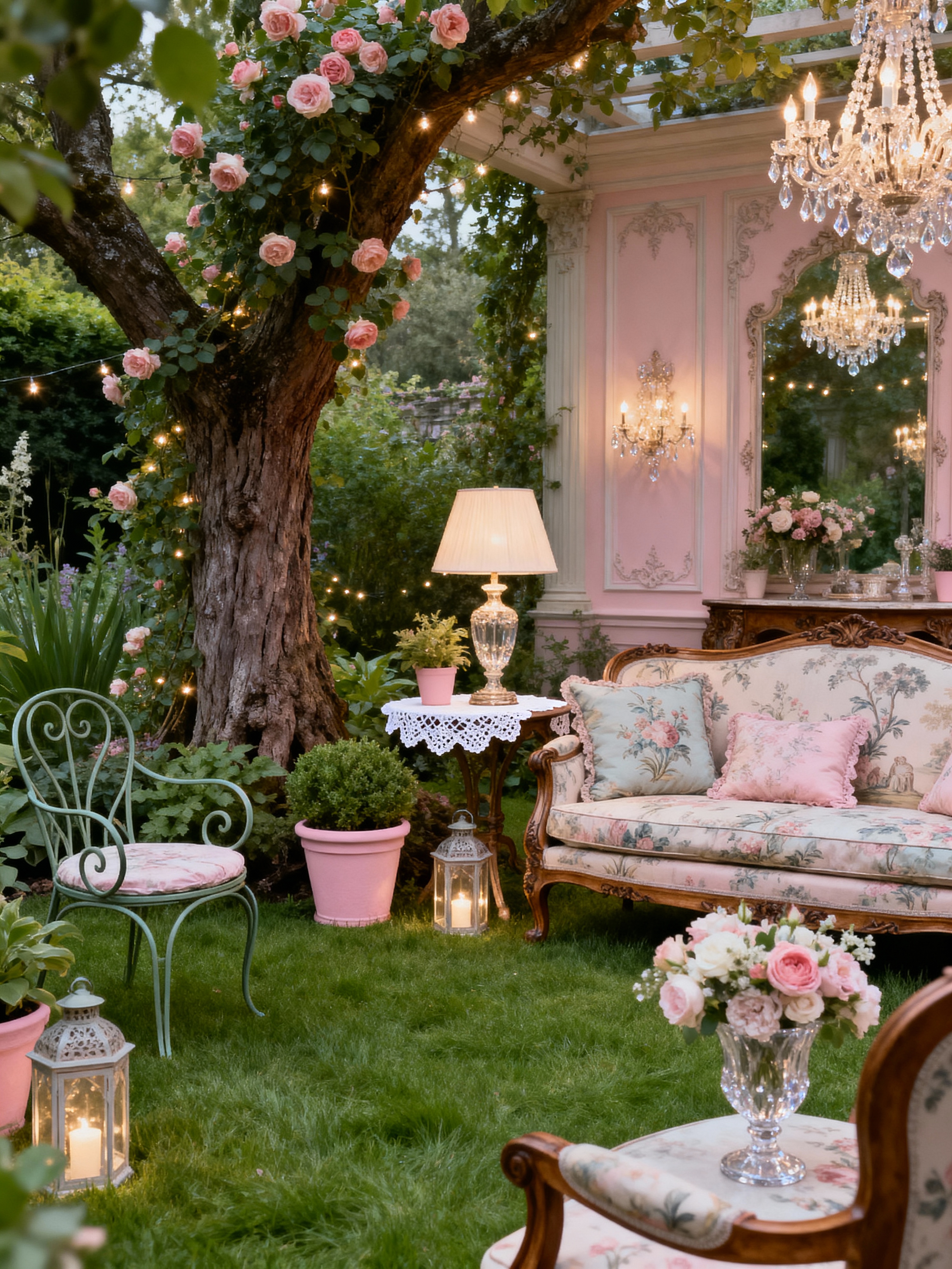 outdoor garden with french style with grass and garden plants and garden tree and grass. . with sophisticated grace and romantic style and ornate furniture and crystal accents and soft pastels and refined luxury and elegant details and toile patterns