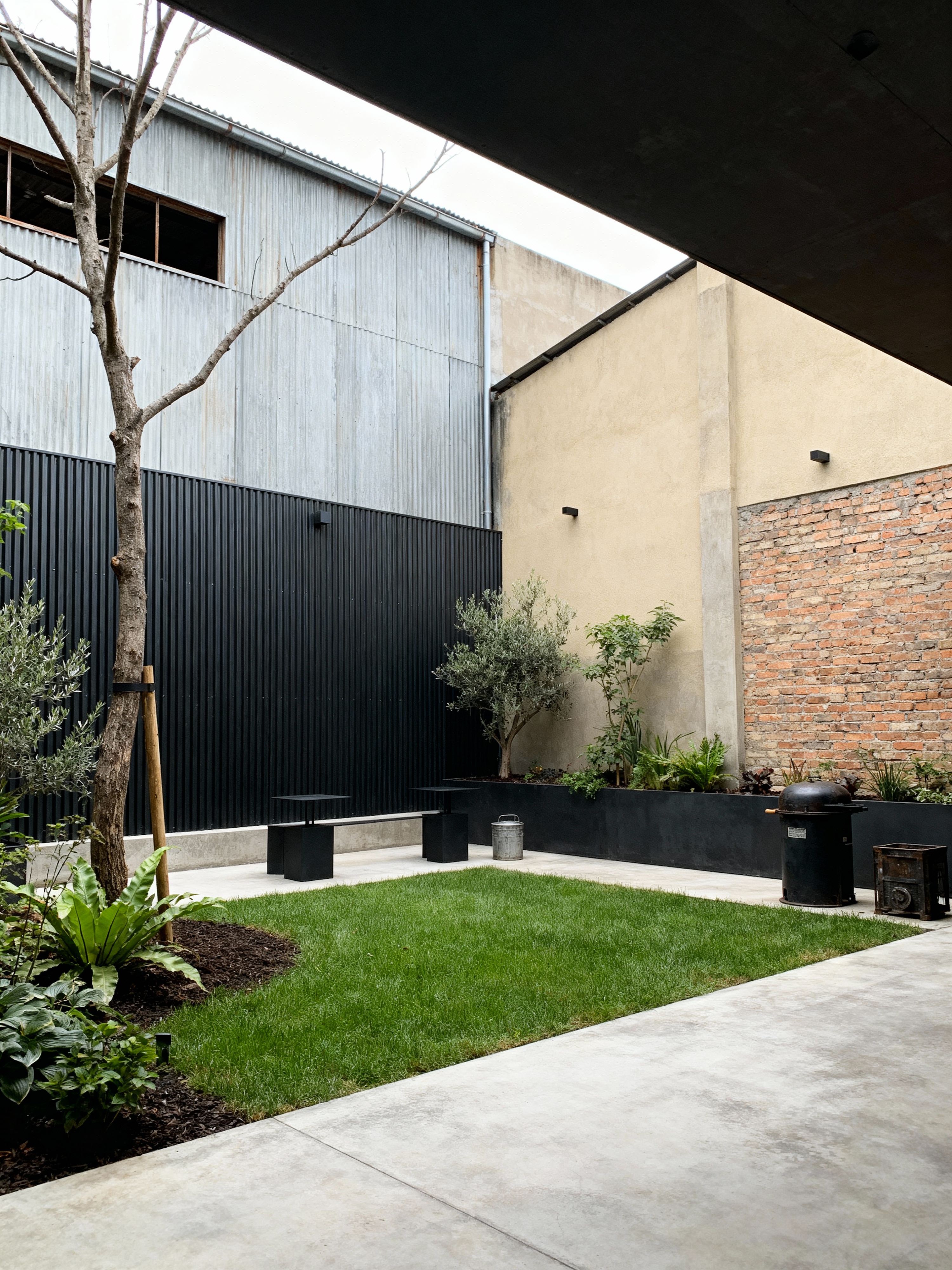 outdoor garden with industrial style with garden tree and garden plants and grass and garden tree. . with raw aesthetic and neutral tones and metal panels and utilitarian objects and open floorplan and factory style and exposed brick and exposed concrete