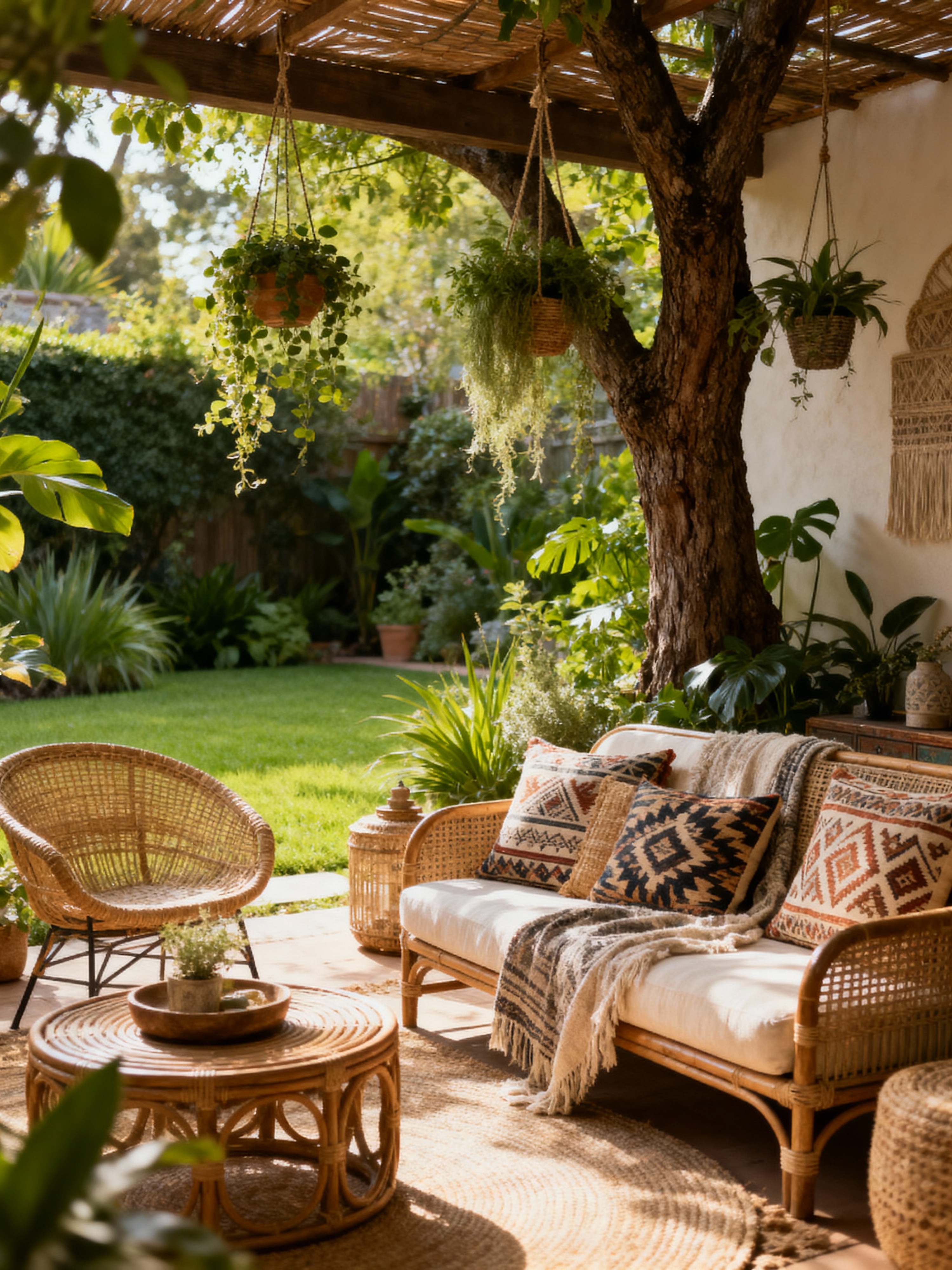 outdoor garden with modern boho style with garden plants and grass and garden tree and garden plants. . with hanging plants and greenery and woven textures and vintage furniture and patterns and warm colors and airy space and earthy tones
