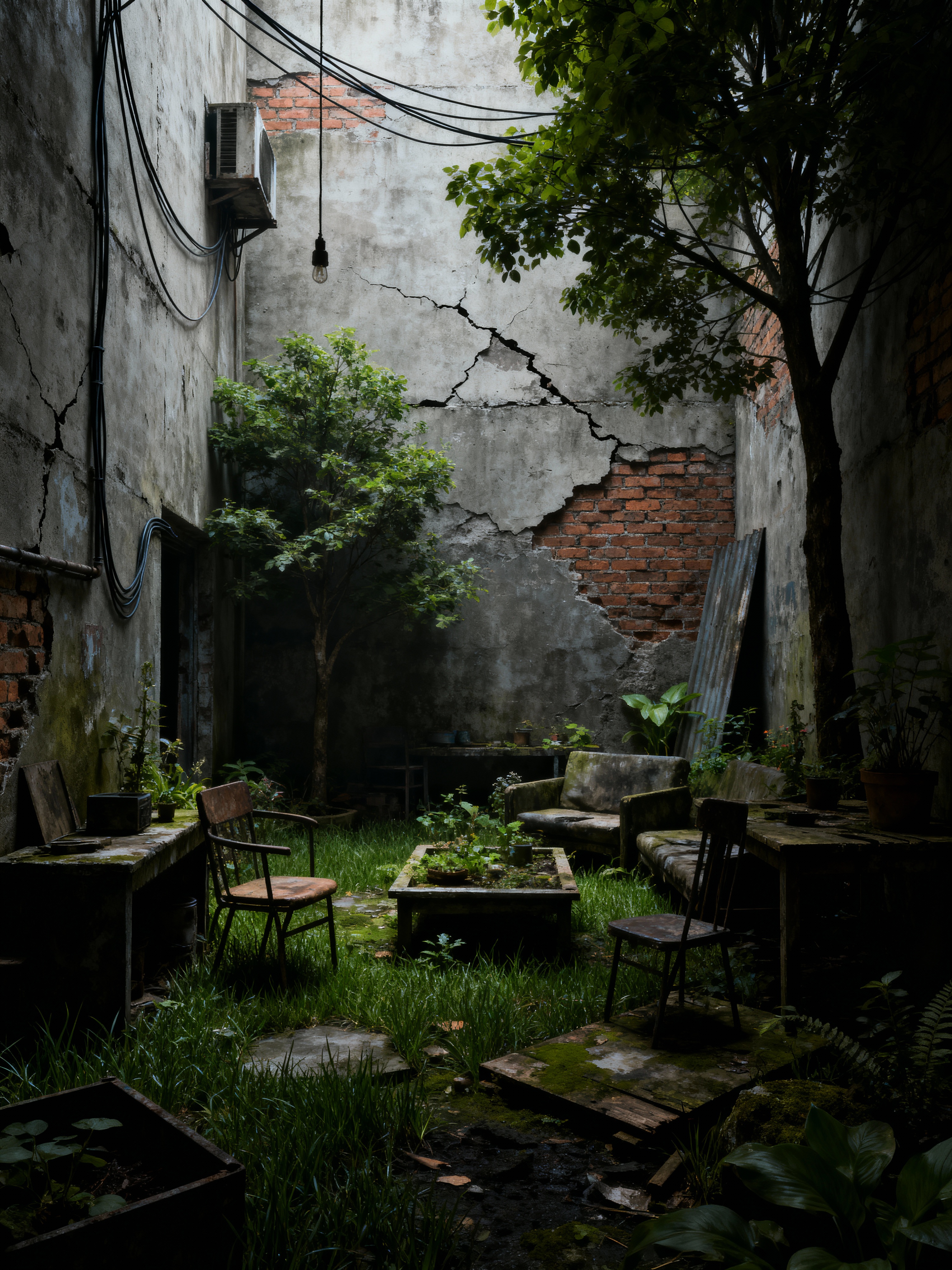 outdoor garden with post-apocalyptic style with grass and garden tree and garden plants and grass. . with dim lighting and worn textures and cracked concrete walls and weathered materials and exposed bricks and makeshift furniture and urbex and hanging exposed wires