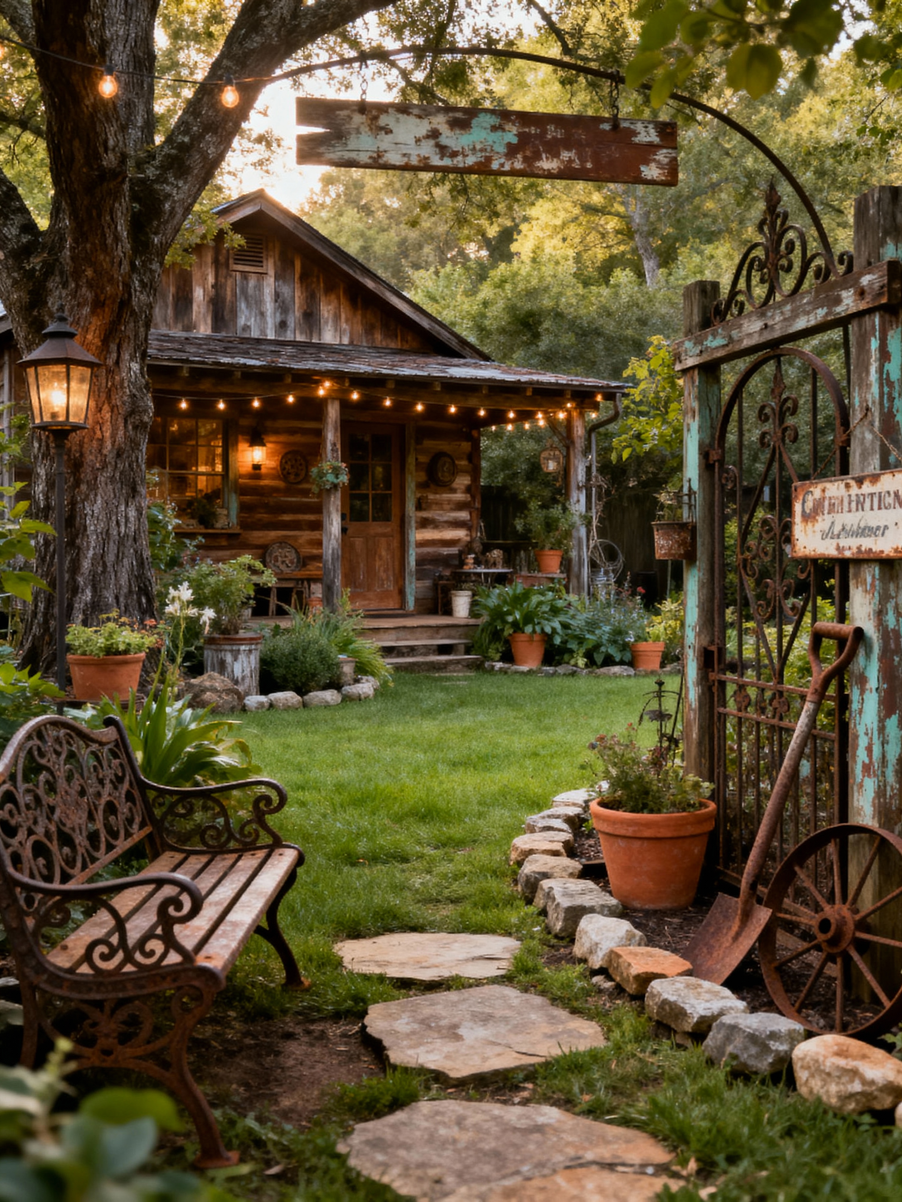outdoor garden with rustic style with garden tree and garden plants and grass and garden tree. . with country style and iron fixtures and stone accents and earthy tones and cozy cabin and distressed finishes and warmth and vintage decor
