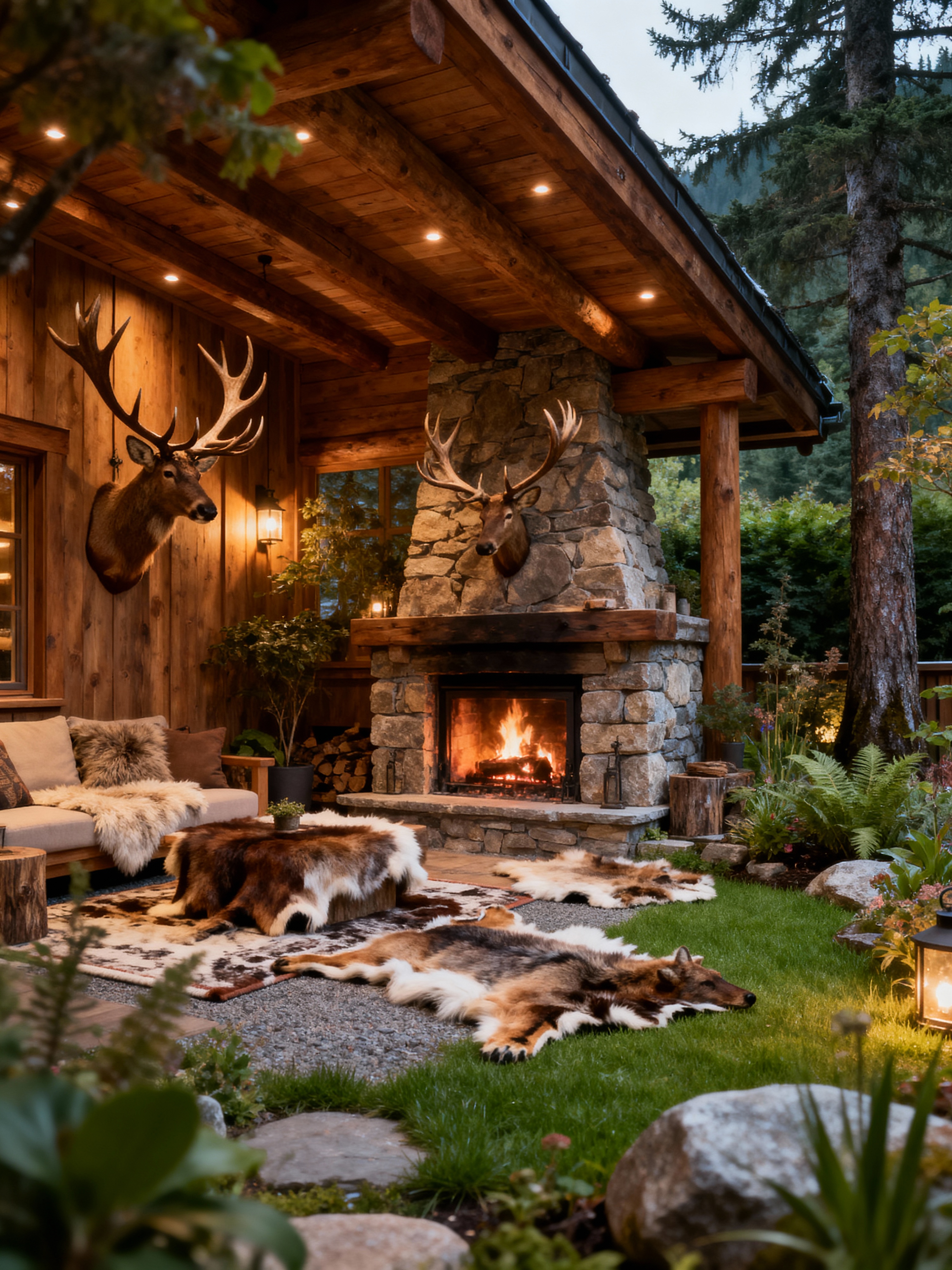 outdoor garden with ski chalet style with garden plants and garden tree and grass and garden plants. . with stone fireplace and animal furs and wood beams and animal rugs and wooden walls and stone fireplace and nature-inspired and hanging wall elk antler