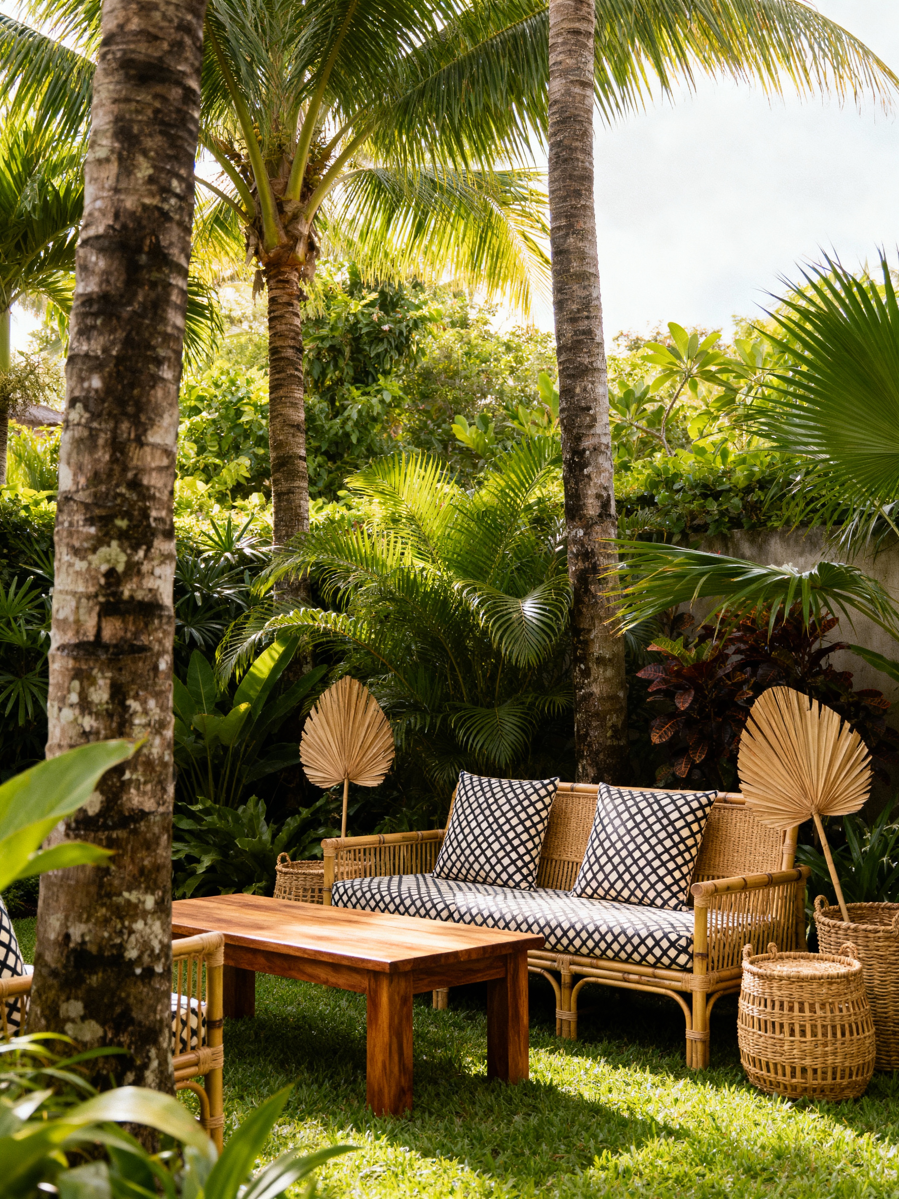 outdoor garden with tropical style with garden plants and garden tree and grass and garden plants. . with cane motifs and wicker and teak and rattan and palm leaves and palm trees and lattice prints and bamboo
