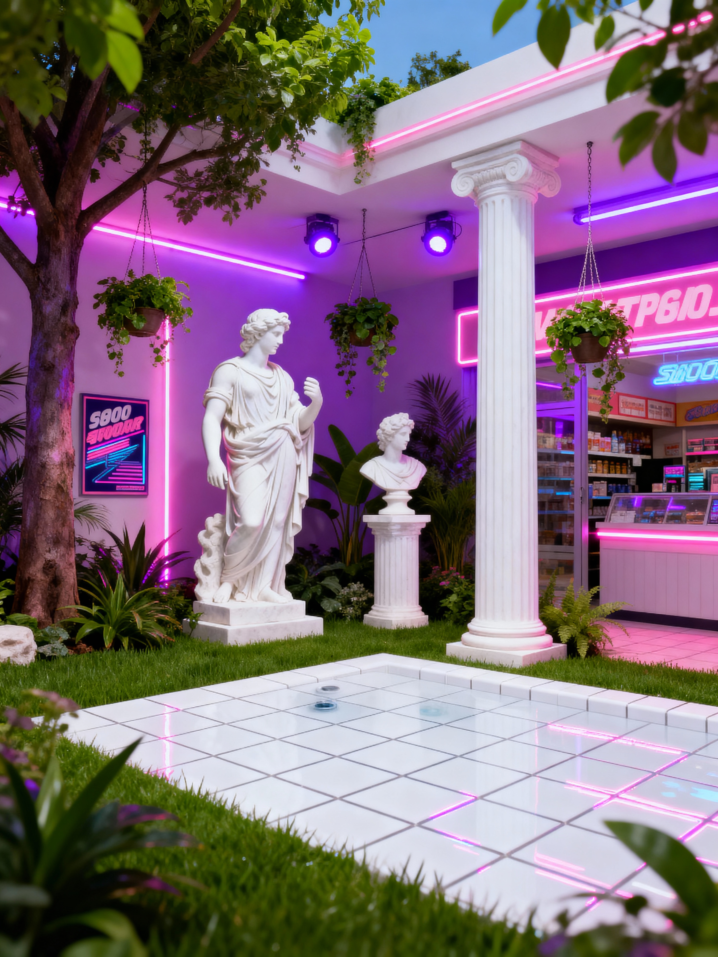 outdoor garden with vaporwave style with garden tree and grass and garden plants and garden tree. . with 1980s retail shops and white roman statues, white roman sculptures, white roman columns, white roman pillars in the center of the room, and white roman statues, white roman sculptures, white roman columns, white roman pillars in the center of the room, and hanging plants and purple lights and bright pink and neon glow and white square bath tiles