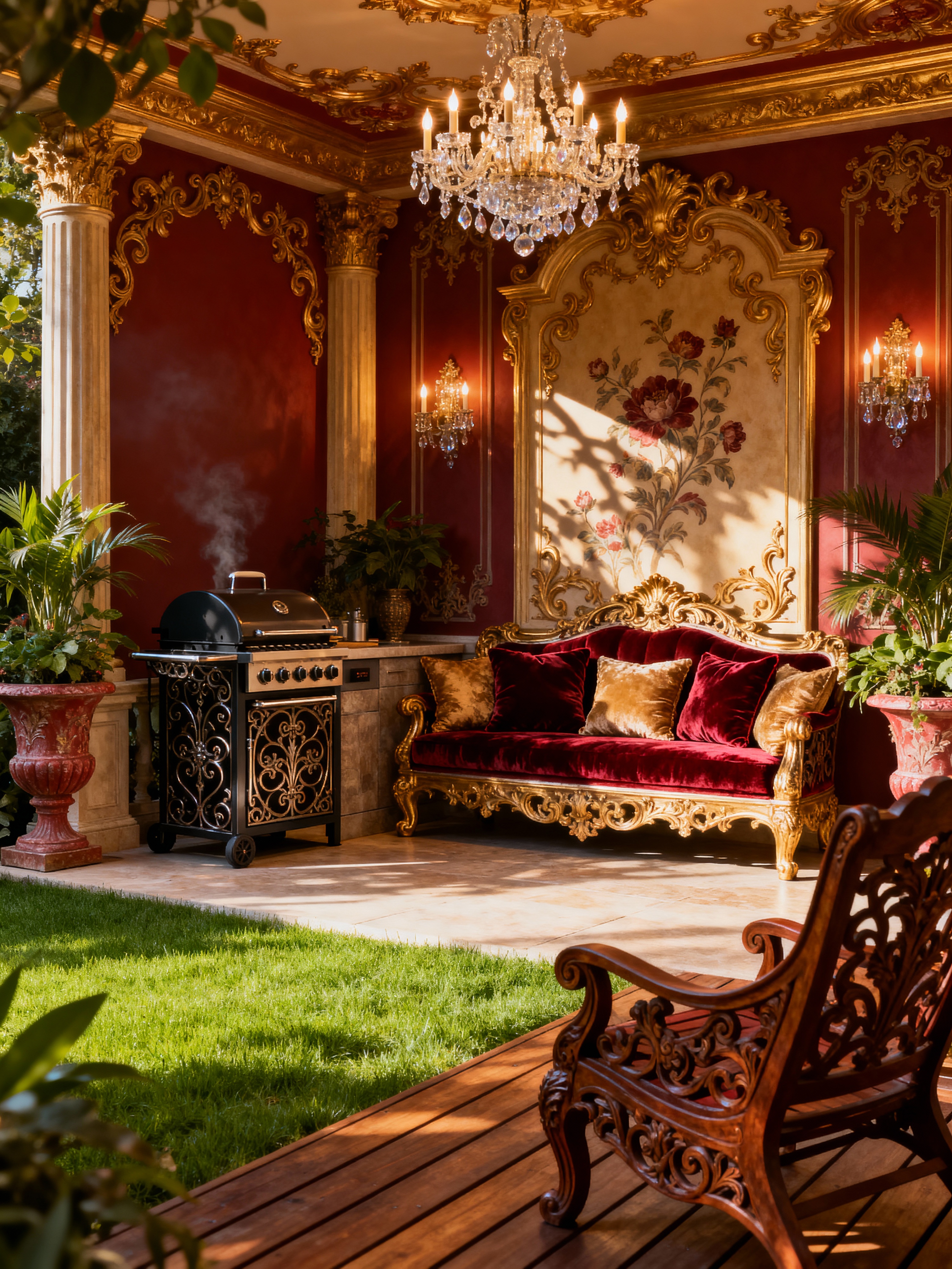 outdoor patio with baroque style with plant and patio couch with pillows and barbeque or grill and grass and deck with deck chairs and plant. . with drama and sensuous richness and heavy moldings and pedestal feet and grandeur and tension and crystal and glass accents and elaborate ornamentation