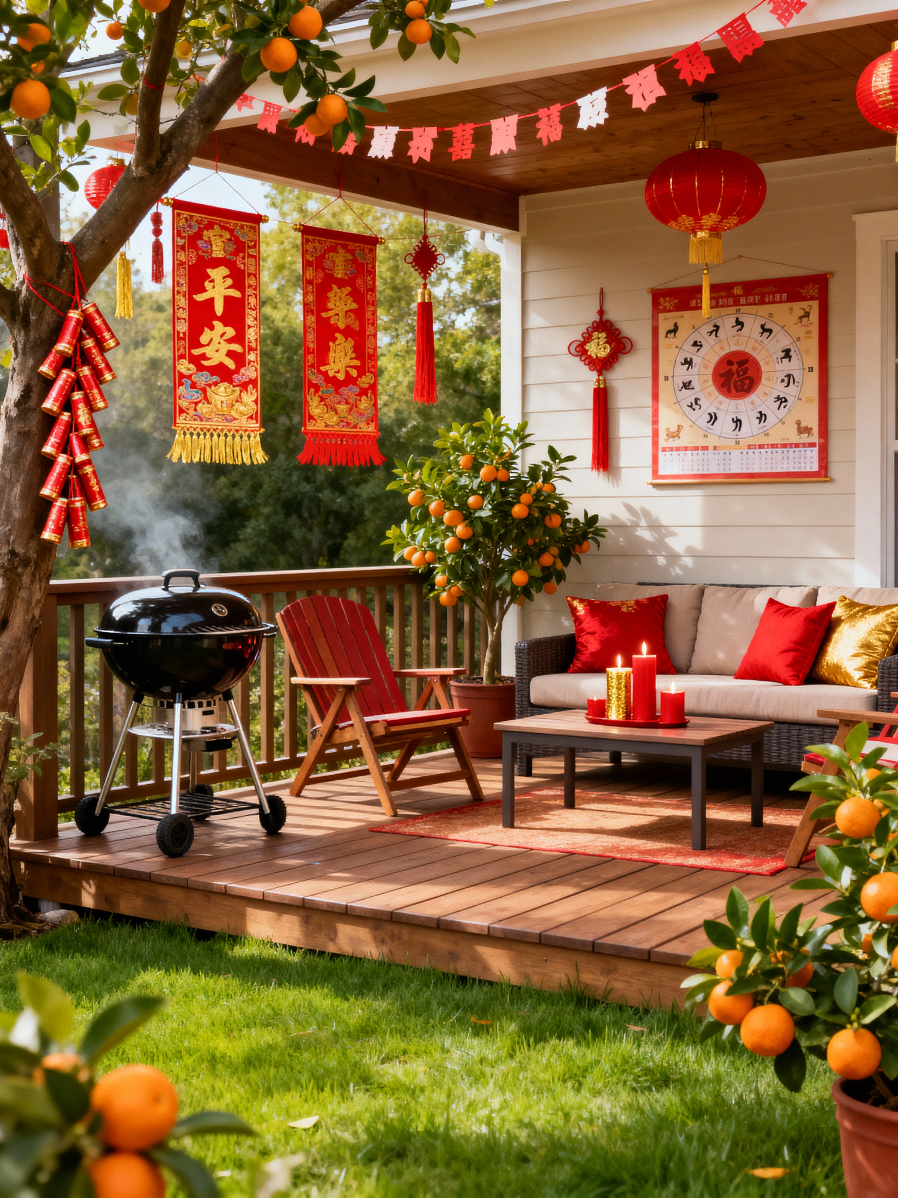 outdoor patio with chinese new year style with deck with deck chairs and barbeque or grill and plant and patio couch with pillows and grass and deck with deck chairs. . with fai chun banners and red and gold tassels and zodiac calendar and red and gold candles and chinese red lanterns and paper firecrackers and kumquat trees and orange trees