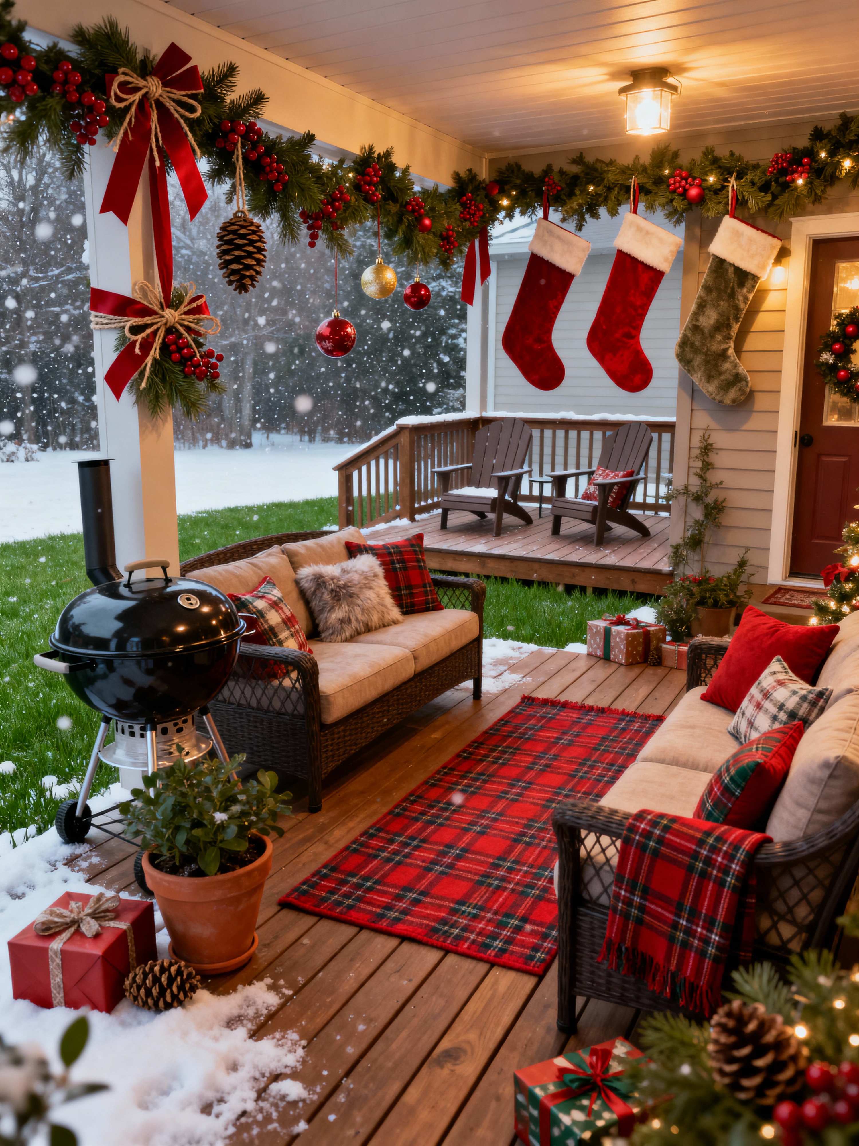 outdoor patio with christmas style with patio couch with pillows and barbeque or grill and plant and grass and deck with deck chairs and patio couch with pillows. . with ribbons and tie pinecones and berries and a few big socks hanging and christmas ornaments and plaid rugs and snow outside and berries and greenery draped and giftwrapped gifts